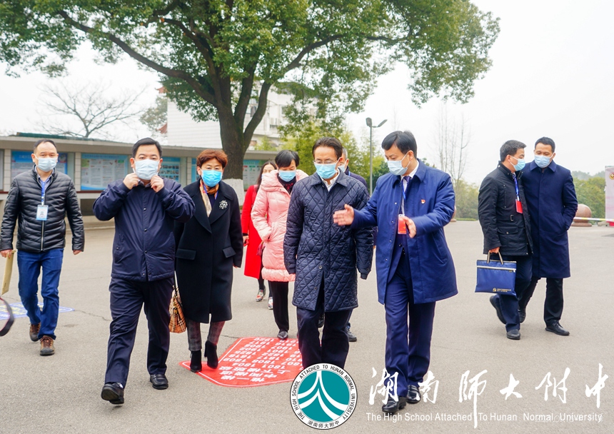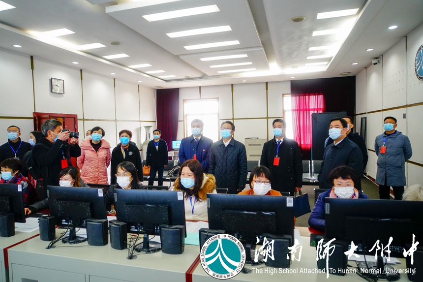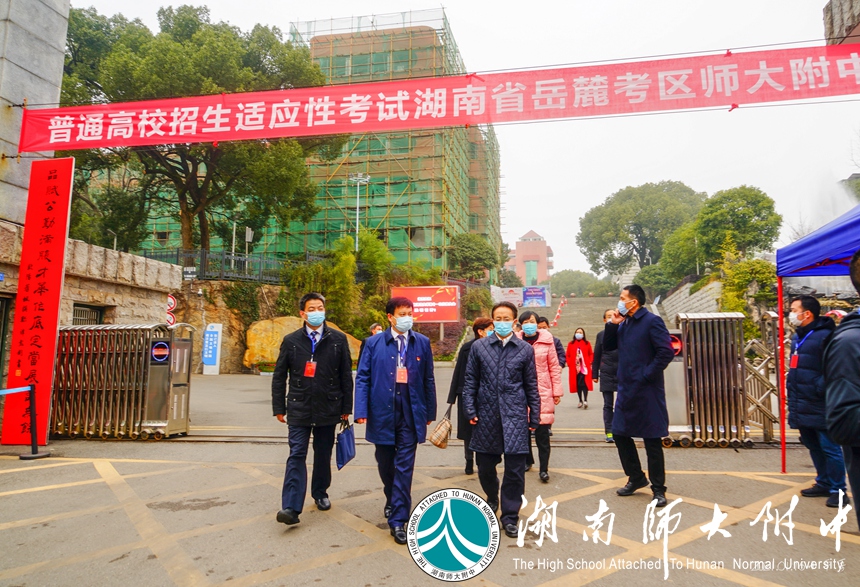 1月23日,湖南师大附中考点2021年新高考适应性考试组考工作有序进行。上午九时许,省教育厅党组副书记、副厅长王瑰曙,省教育考试院党委书记罗桂香,市教育局副局长邓芸,市教育考试院院长刘罗春,岳麓区教育局局长李鸿等来我校督查考点组考工作。我校校长谢永红、副校长苏建祥陪同督查。