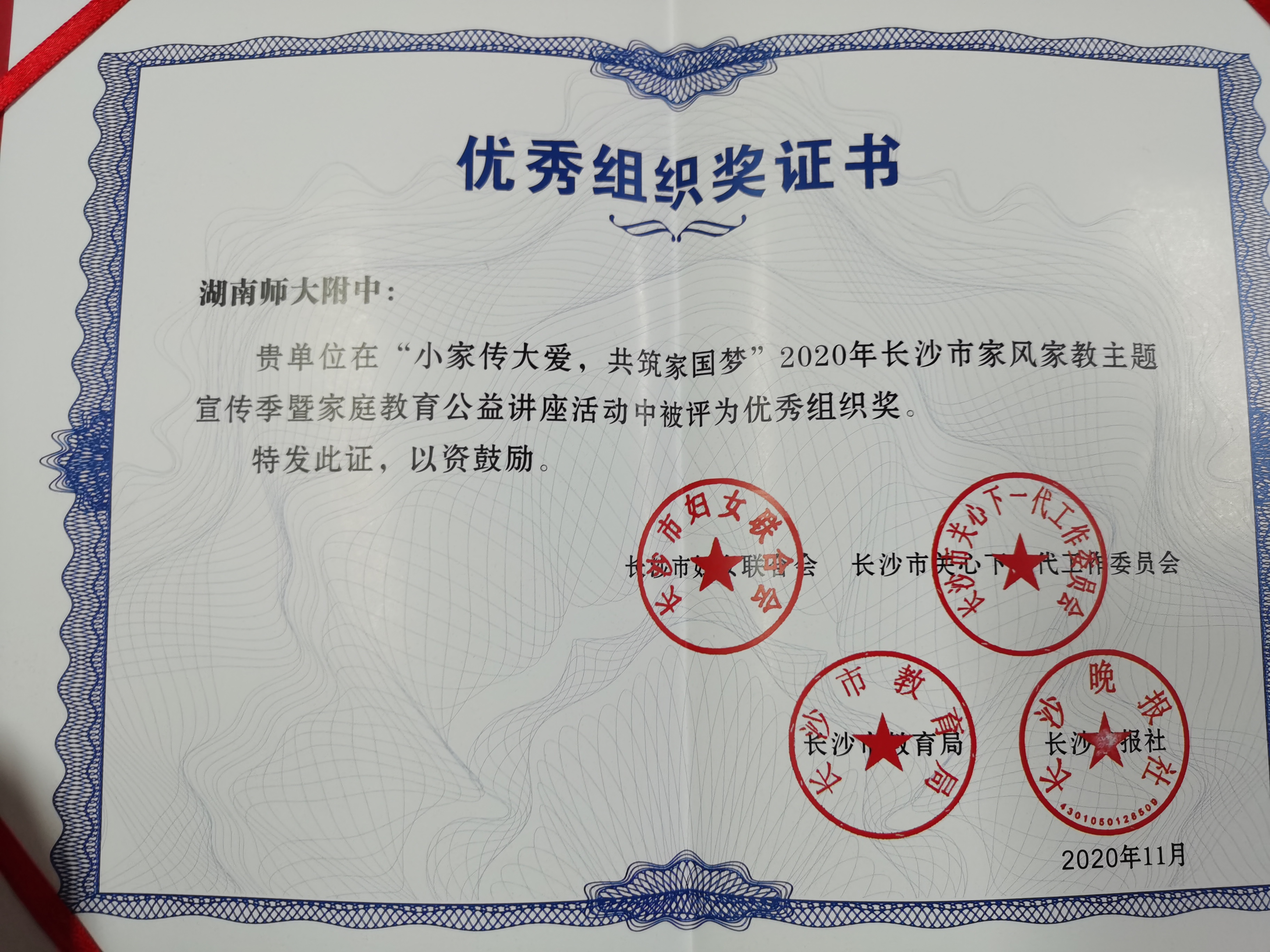 近日,我校在“小家传大爱 共筑家国梦”2020年长沙市家风家教主题宣传季暨家庭教育公益讲座活动中被评为优秀组织奖。