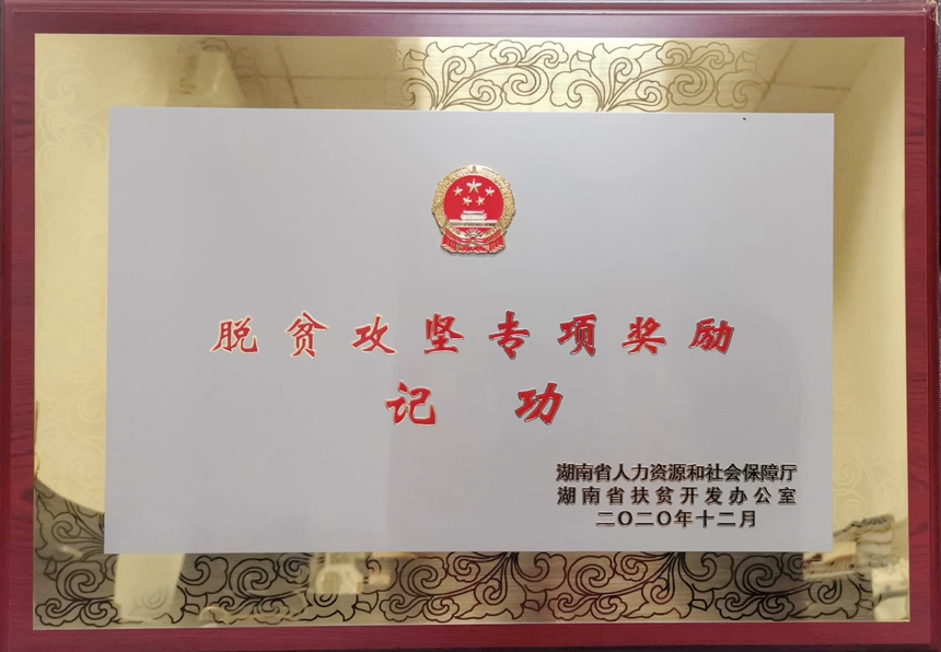 在贯彻落实习近平总书记重要指示精神、党中央、国务院和省委、省政府关于脱贫攻坚重大战略部署中,我校围绕脱贫攻坚目标任务积极开展工作,脱贫攻坚成效显著。经严格选拔,我校被评为湖南师范大学“脱贫攻坚先进集体”,被湖南省人力资源和社会保障厅、湖南省扶贫开发办公室记功并授予奖牌。