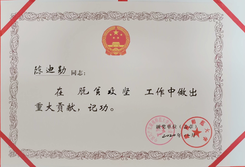 在精准扶贫精准脱贫工作中,陈迪勋忠于职守、勤勉尽责,特别是深入插柳村脱贫攻坚一线,情系贫困群众,有强烈的事业心和责任感,艰苦奋斗、积极作为、勇于担当,出色完成了扶贫任务。经严格选拔,陈迪勋被评为湖南师范大学“脱贫攻坚优秀个人”,被湖南省委组织部、湖南省人力资源和社会保障厅记功并授予奖章。
