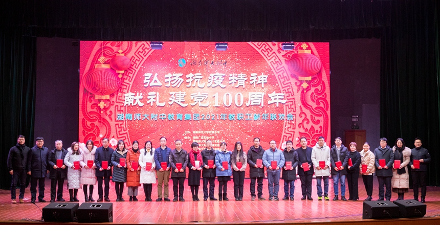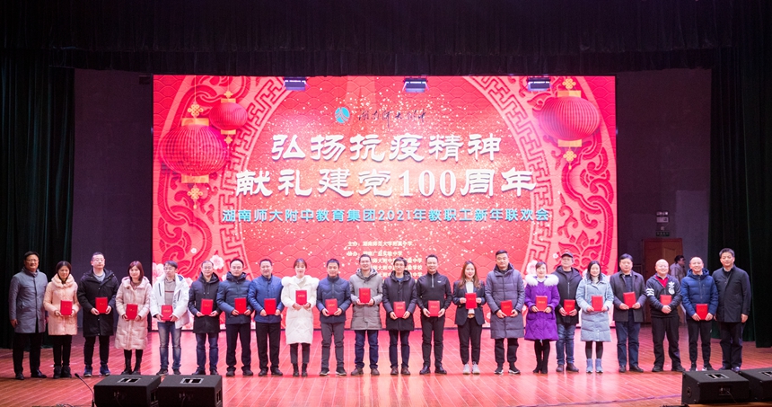 晚上7:30,湖南师大附中教育集团2021年教职工新年联欢会在学生活动中心隆重举行,附中集团代表们其乐融融地参加联欢活动。会上,谢永红代表学校党委、行政作新年贺词,黄月初宣读集团2020年度先进集体、先进个人表彰名单,附中梅溪湖、附中星城2所学校和集团校51名先进个人接受表彰。