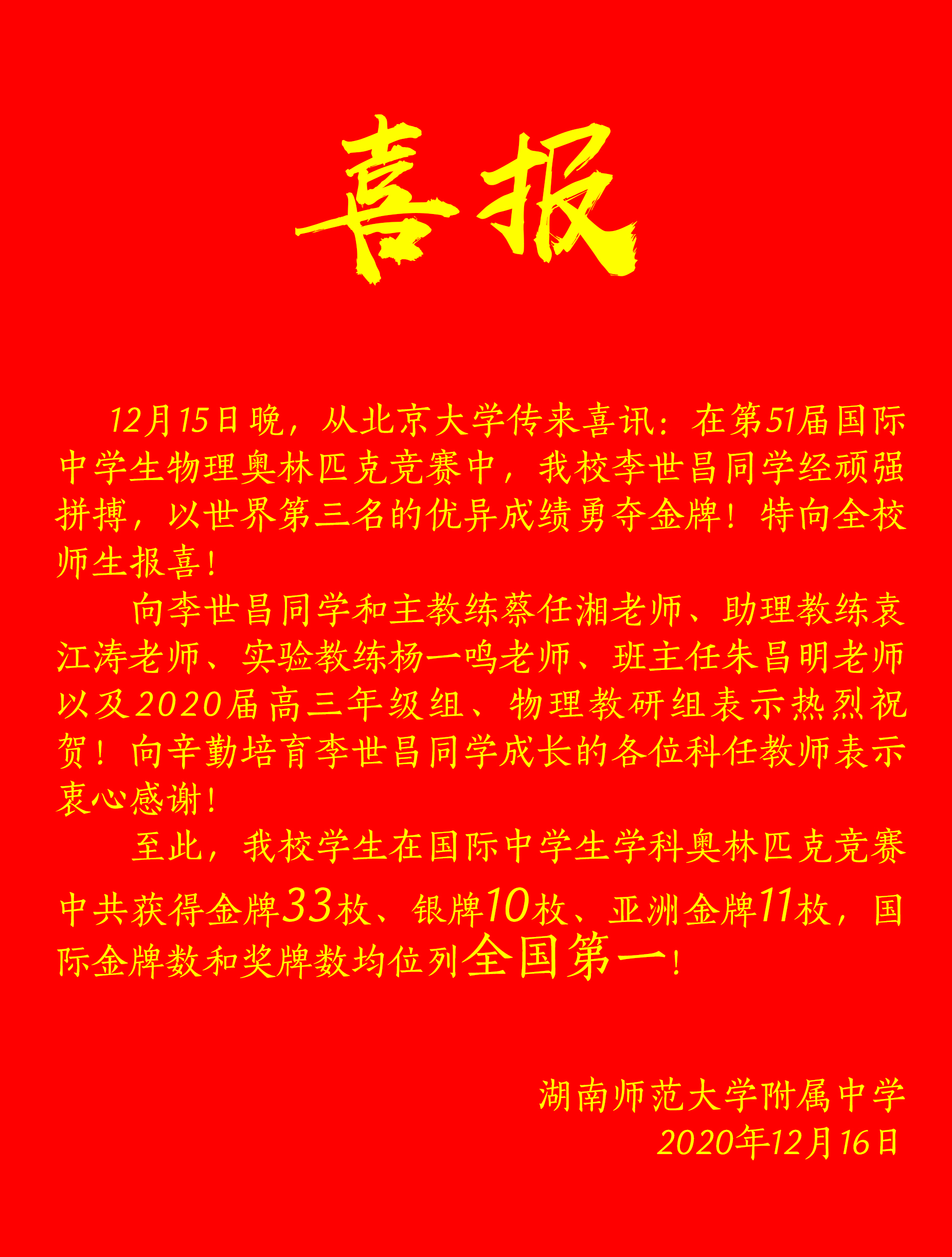喜报:李世昌同学勇夺第51届国际中学生物理奥林匹克竞赛金牌 来源:科技创新处 发布时间:2020-12-16 浏览次数: 次 【字体:小 大】 左一为李世昌同学 右一为李世昌同学 李世昌同学在攀登碑前 2019年10月,李世昌同学入选国家集训队时与校长谢永红、教练团队及班主任老师合影 我校物理学科奥赛金牌教练团队 点赞 收藏 分享到: 【打印正文】 相关内容