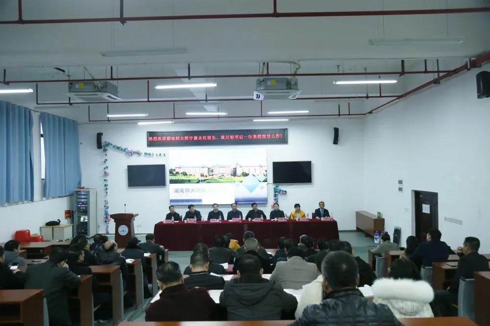 12月12日,我校校长谢永红,党委书记黄月初、副书记彭荣宏,副校长陈迪勋,纪检书记李春莲,教育集团办公室主任李文昭一行6人前往湖南师范大学附属五雅中学(简称“师大五雅”)指导工作。