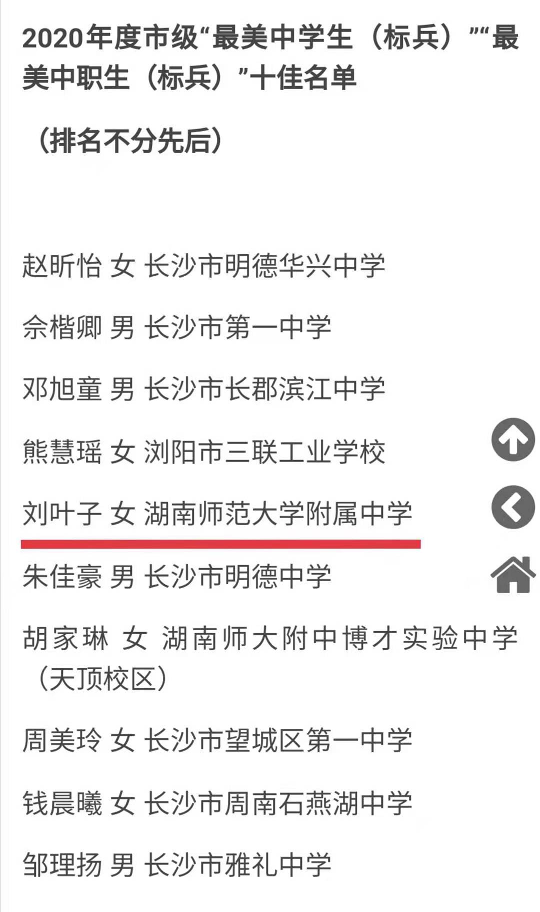 刘叶子同学荣获2020年度长沙市“最美中学生(标兵)”光荣称号