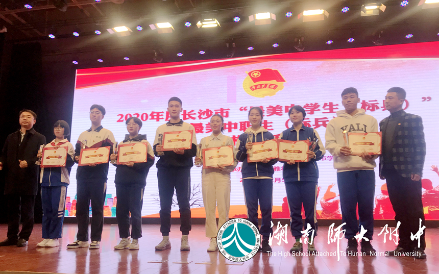 第二十七届全国学联代表、我校学生会主席刘叶子经过材料申报、团市委审批,成功入围长沙市“最美中学生”名单;12月5日在雅礼中学礼堂的现场风采展示中,刘叶子凭借紧跟时代、个性鲜明的主题,自信大方、扣人心弦的谈吐,在20位候选人中脱颖而出,得到评委老师们的一致好评,荣获2020年度市级“最美中学生(标兵)”的荣誉称号。
