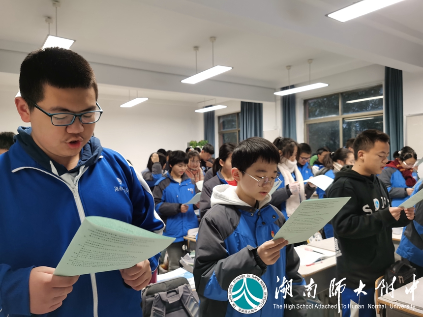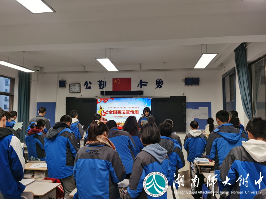 12月4日7点20分,全校3000余名学生肃穆站立,手持《宪法》诵读单,在团委书记李钊的带领下集体诵读《宪法》第一章总纲、第二章公民的基本权利和义务(节选),神情认真严肃,声音洪亮坚定,响彻整个校园。通过宪法诵读活动,拉近了宪法与师生的距离,促进了宪法意识和宪法权威的树立,提高了师生学法、知法、懂法、守法、护法的自觉性,营造了良好的法治宣传教育氛围。李钊倡议同学们感受宪法的崇高和庄严,领会宪法在国家政治经济和社会生活中的重要地位,培养对宪法的认同和尊重,增强爱国意识、宪法意识和责任意识,成为宪法的忠实崇尚者、自觉遵守者和坚定捍卫者。