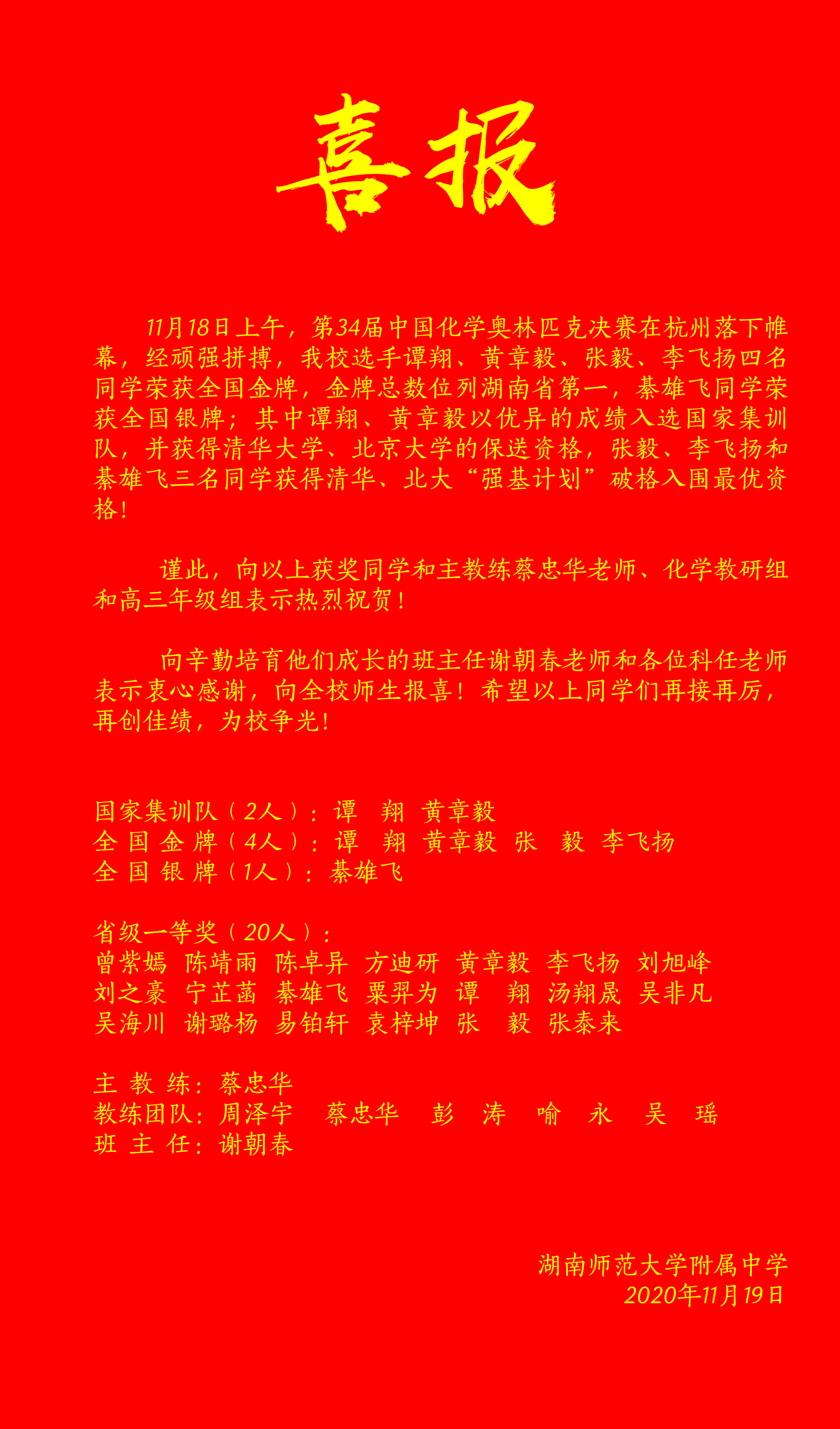 喜报:我校学子全国化学决赛喜获4金1银,金牌总数全省第一,2人入选国家集训队 来源:科技创新处 发布时间:2020-12-01 浏览次数: 次 【字体:小 大】 点赞 收藏 分享到: 系统设置 【打印正文】 相关内容