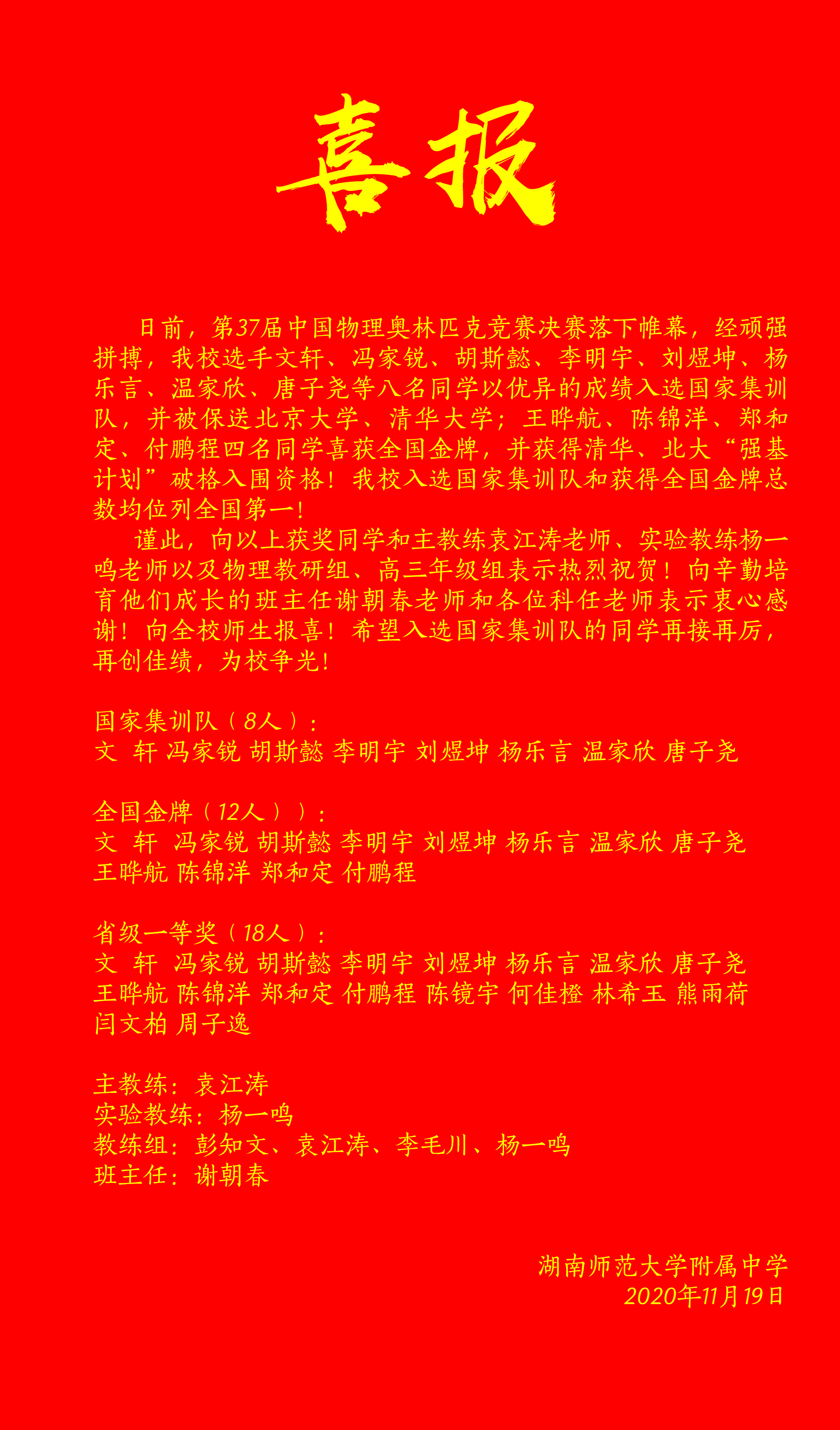 喜报:我校八名学子入选物理国家集训队,位列全国第一