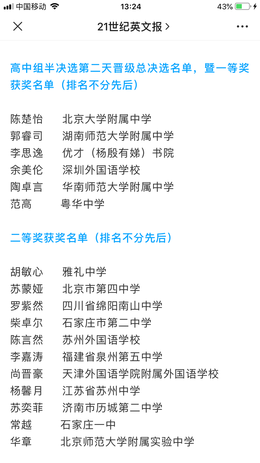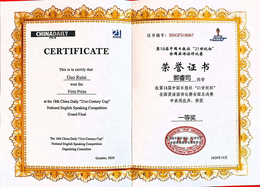 郭睿司同学斩获第18届中国日报社“21世纪杯”全国英语演讲比赛总决赛高中组一等奖