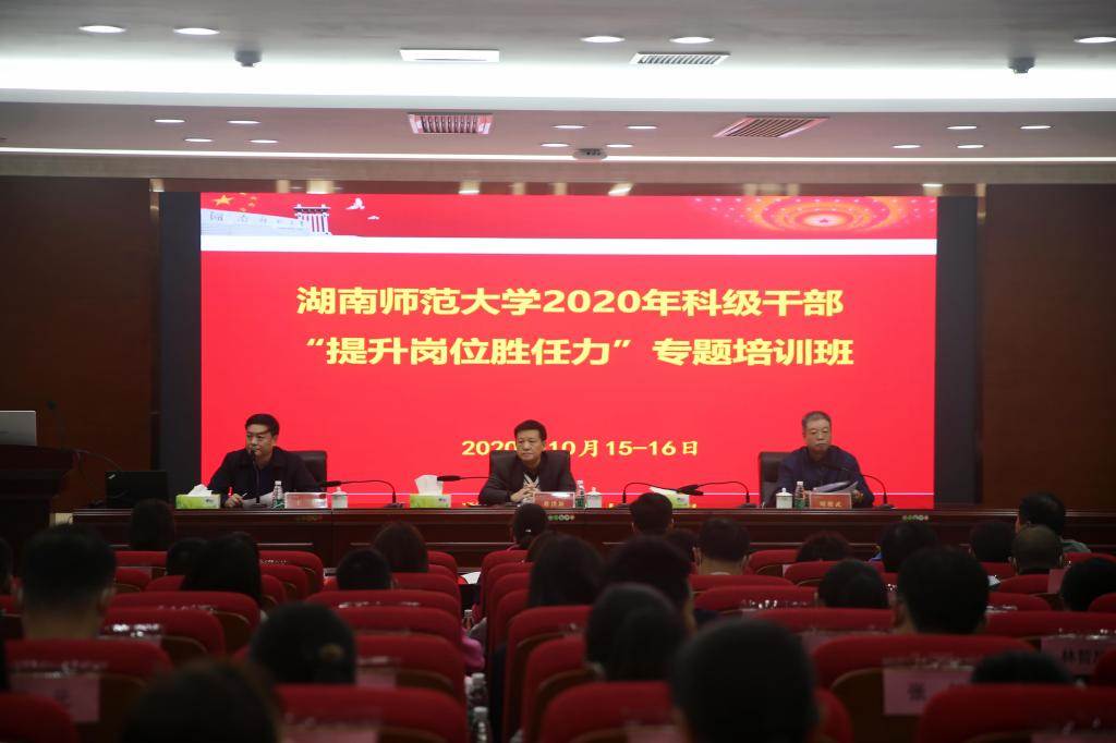 10月15—16日,湖南师范大学2020年科级干部“提升岗位胜任力”专题培训班在师大中和楼342报告厅举办。校党委书记蒋洪新、校长刘起军为培训班授课。我校张迪平等11位2016年来提任的科级干部参加了培训。