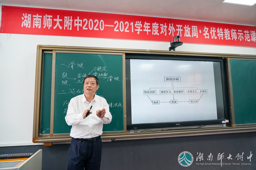 10月14日下午,我校对外开放周地理名优特示范课在科学楼第一多功能厅进行,地理教研组特级教师杨帆老师主讲湘教版新教材必修1中的《滑坡、泥石流》示范课,课堂以学校附近的岳麓山为切入点,依次设置了“岳麓山是否有滑坡泥石流”“为什么我国西南地区多滑坡泥石流”“遇到滑坡、泥石流怎么办”三个课题,每一个课题下又设置了若干探究问题,环环相扣,步步推进,每个课题之后都做了精辟的小结。他用身边的事物做材料,引导学生关注身边的地理,指导学生学会野外考察的方法,引导学生用联系的观点思考问题,时刻关注学生核心素养的培养。课堂上,他关注学习兴趣的培养,学生在课堂上积极参与,老师在学生表达观点后表示赏识和赞叹。“‘活到老学到老’,大家都应该向杨特学习这种治学热情。”有老师谈学习感悟时说道。