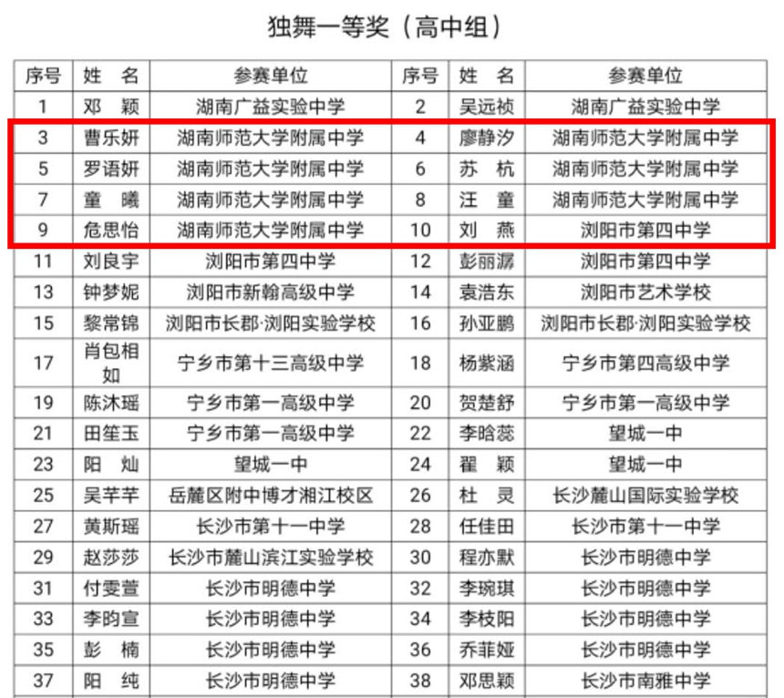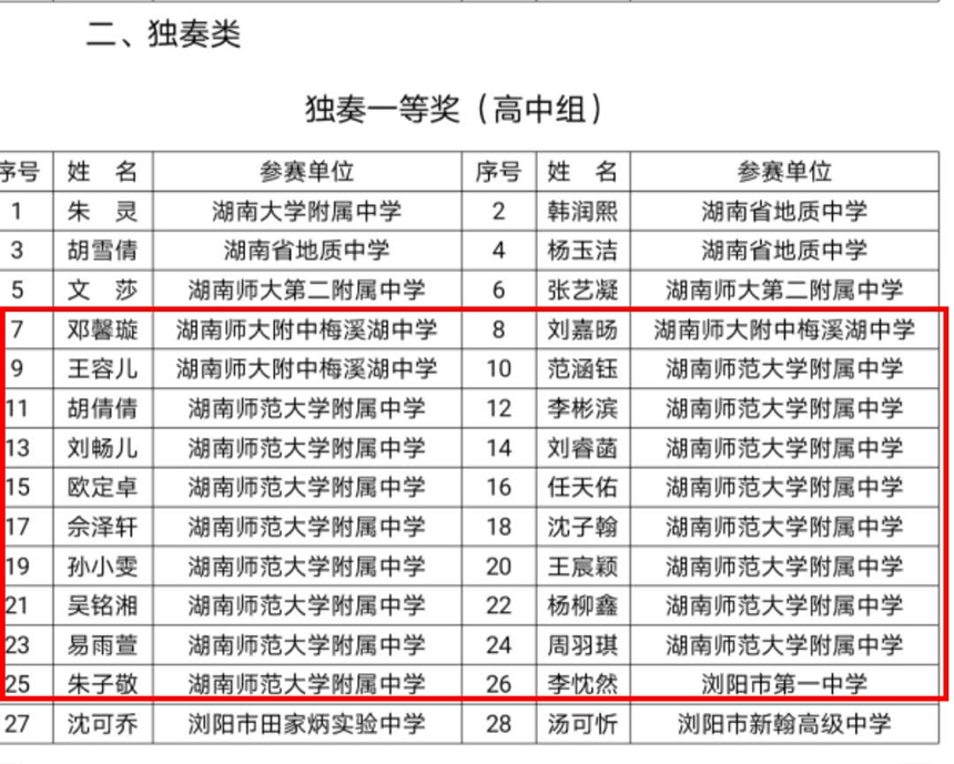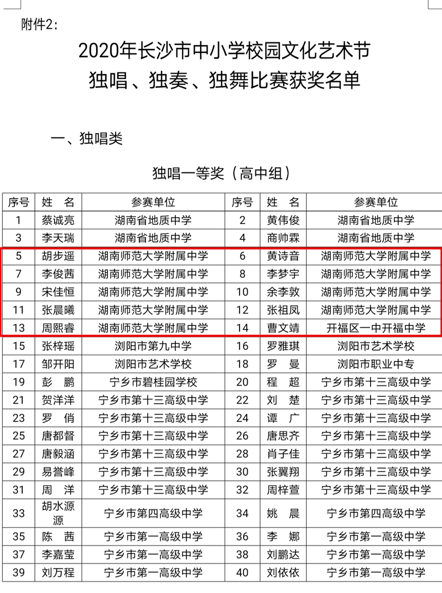 近日,2020年长沙市教育局组织的“三独”比赛(独唱、独舞、独奏)比赛结果揭晓。我校32人获高中组长沙市一等奖,获一等奖总人数在长沙市遥遥领先。李鹏程、熊康、郑喜、戴子丹、周文涛老师获“优秀指导老师”奖。