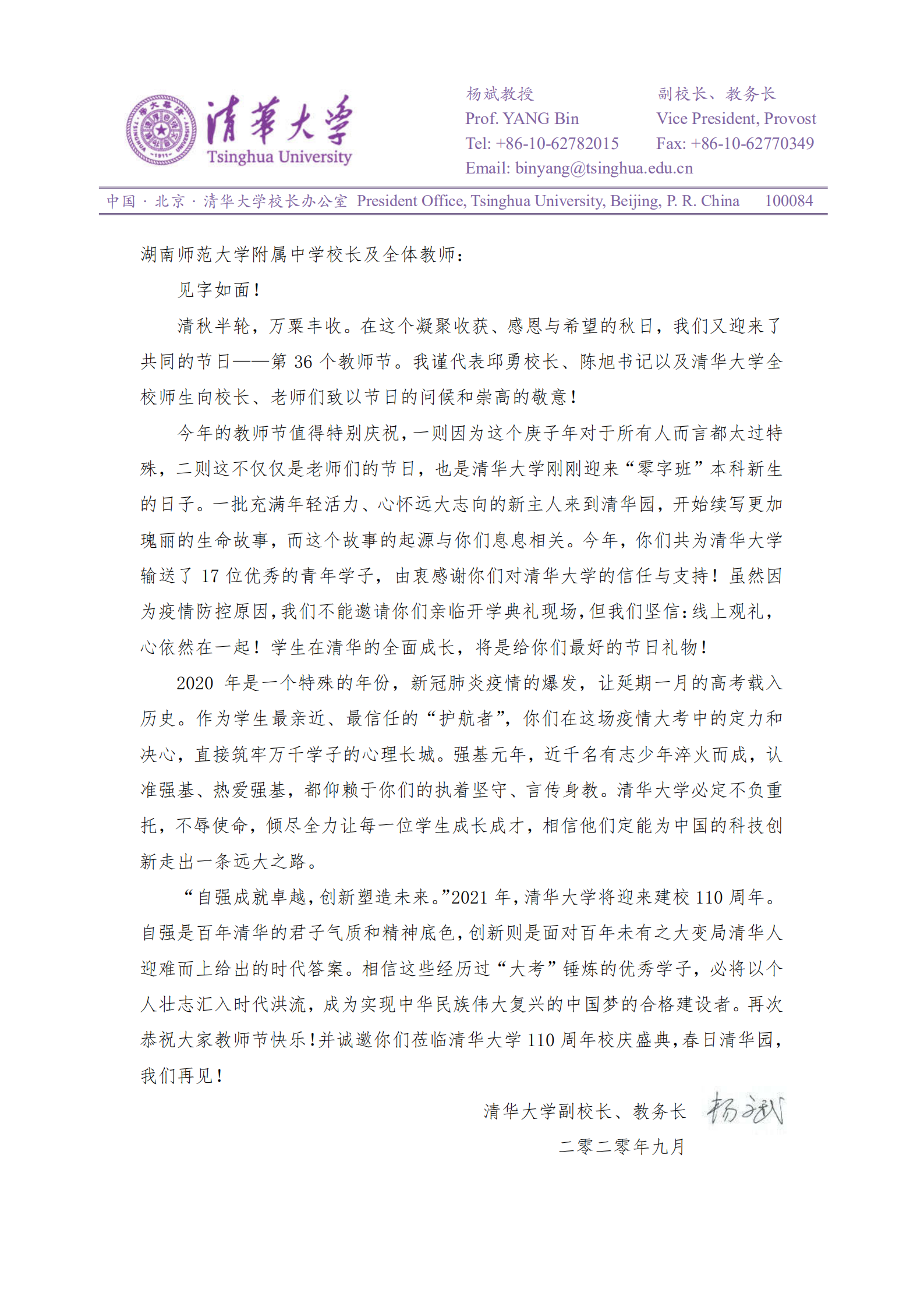 第36个教师节前夕,清华大学发来贺信,向我校教师致以节日的问候。