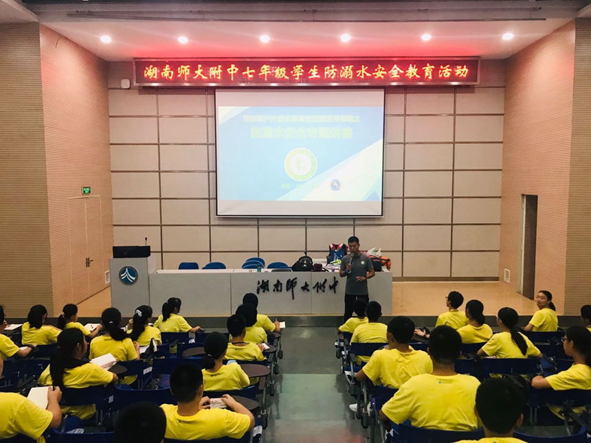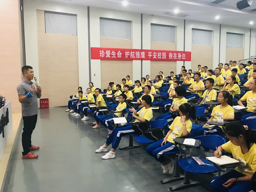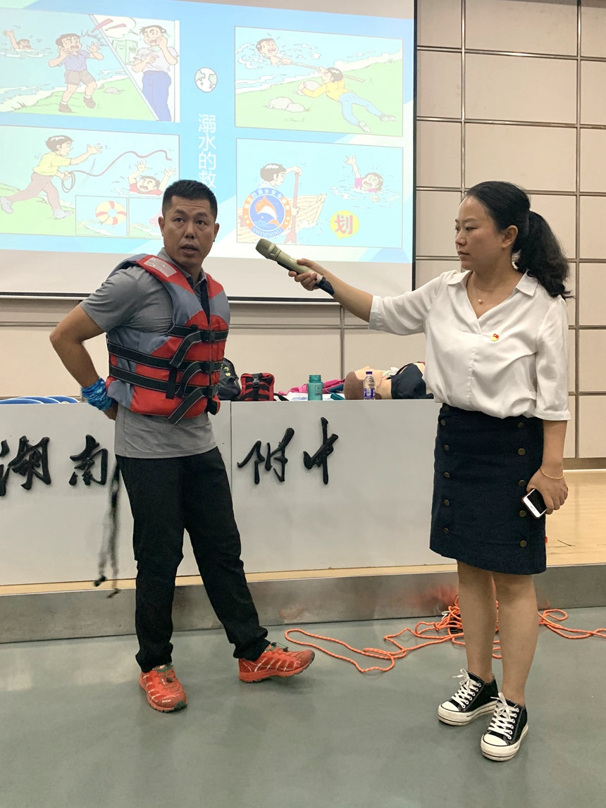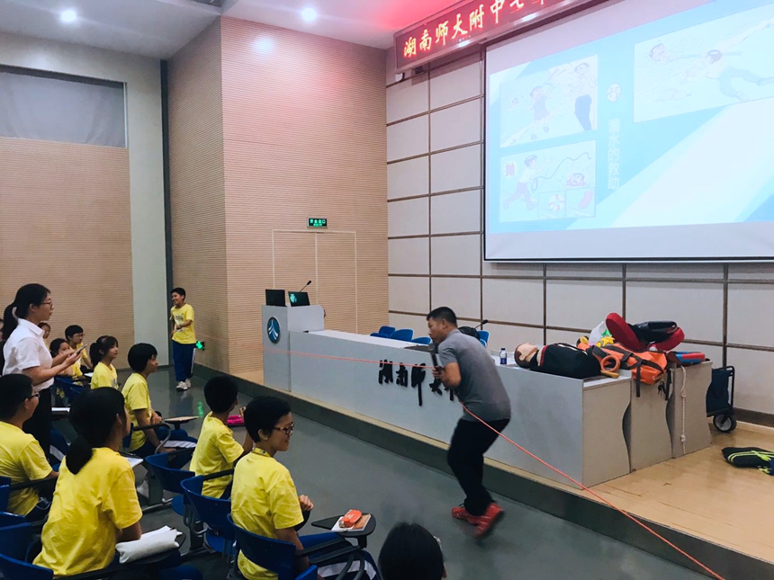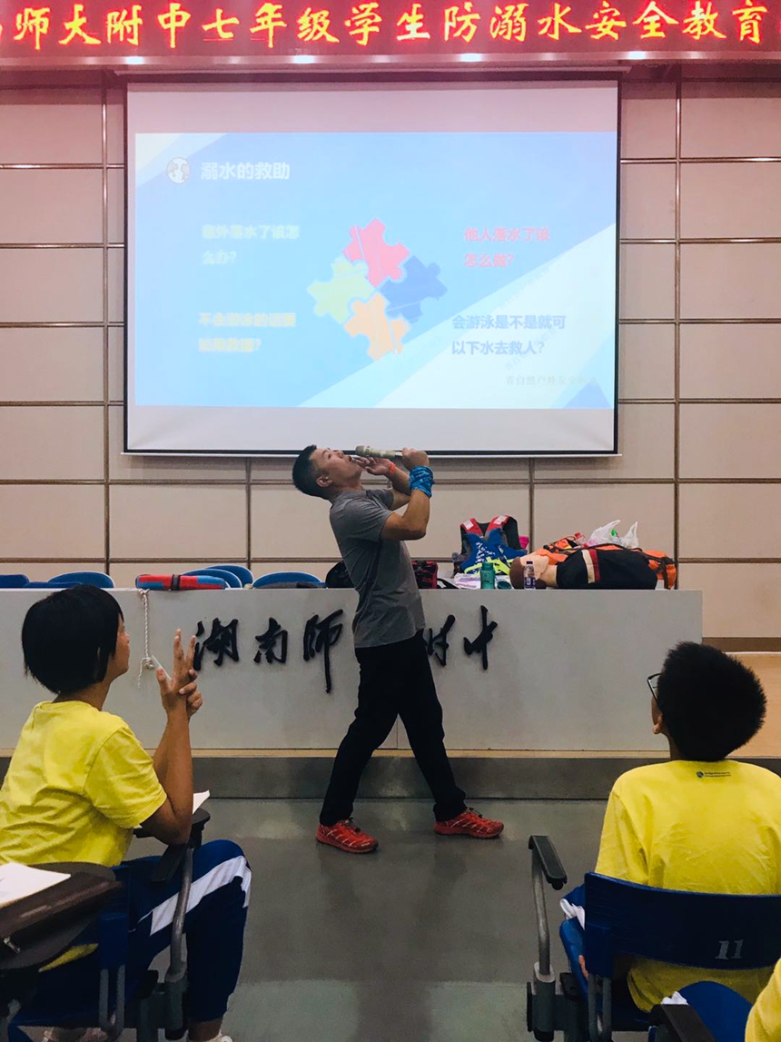 9月3日下午,学校组织七年级师生开展了一场别开生面的防溺水安全教育活动,这也是七年级“家长进课堂”系列活动的第一课。活动邀请湖南省应急救援队员、望城区水上救援队瓯宝教官主讲。