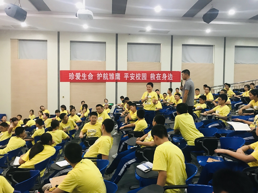 瓯宝教官首先介绍了溺水的概念与危害,用一个个鲜活的溺水身亡案例,分析事件发生的原因,让学生深刻认识到溺水事故的严重后果,防溺水的重要性。接着他介绍了溺水的成因及征兆,同学们仔细聆听,认真记笔记,积极互动,踊跃参与。