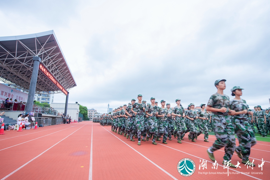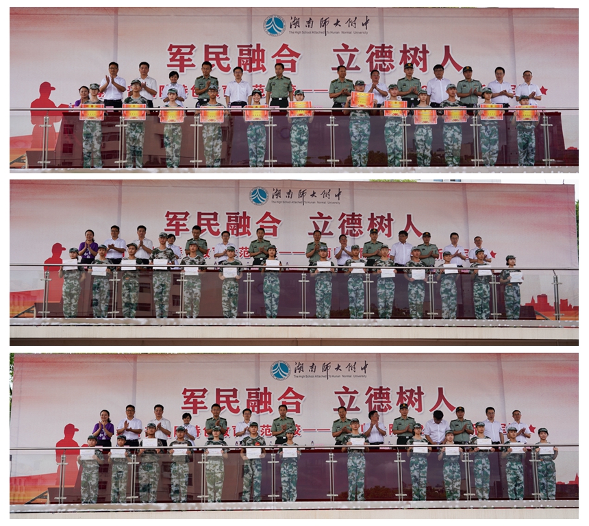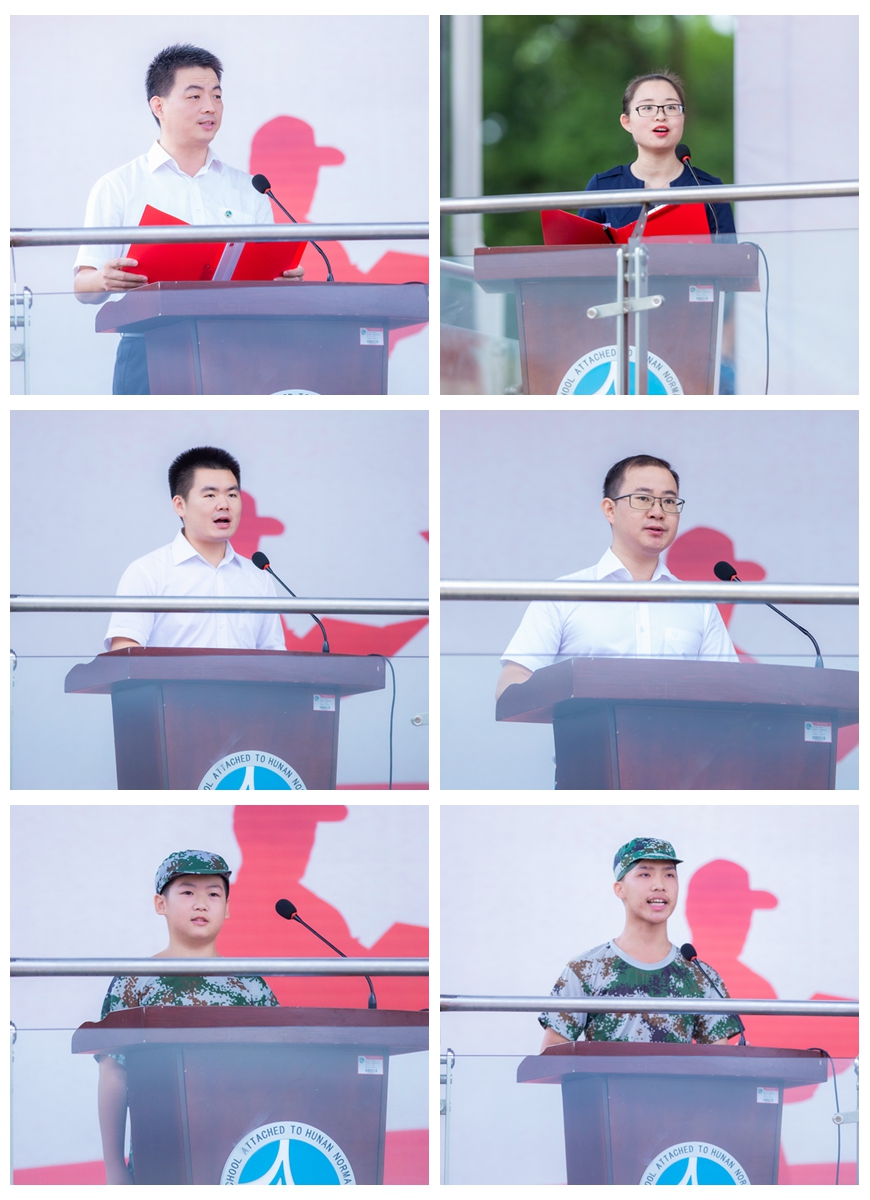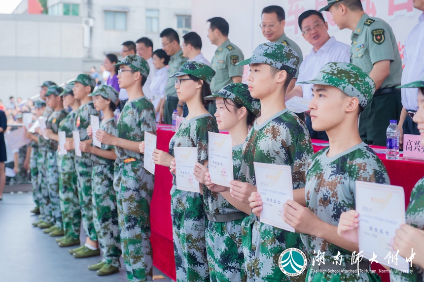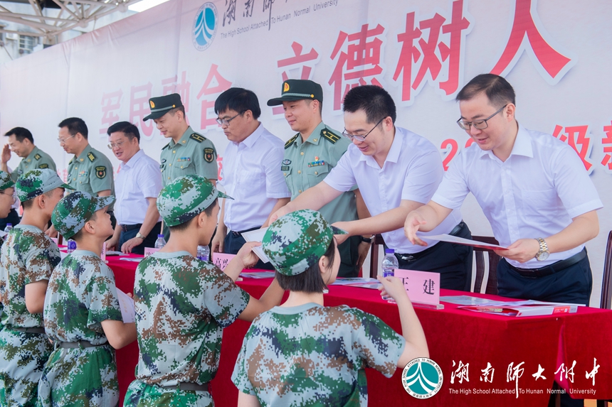 国防科技大学教务处副处长汪诗林大校、参谋李君神少校,军事基础教育学院学员一大队大队长何华强上校,学员一大队二队政治教导员郑茂森少校,一大队六队政治教导员高兴亮少校,我校校长谢永红,党委书记黄月初,党委副书记彭荣宏,副校长、工会主席陈迪勋,纪检书记李春莲,副校长苏建祥、蔡任湘,挂职副校长杜军,高一年级组组长王建,初一年级组组长吴菲在主席台就坐。大会由德育与学生发展处主任吴卿主持。