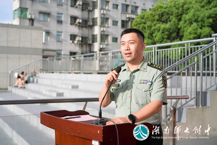 国防科技大学军训带队领导崔小健上校讲话,他向全体附中师生致以真诚的问候,并寄语参训的学生吃苦耐劳,磨练自我,学有所获。