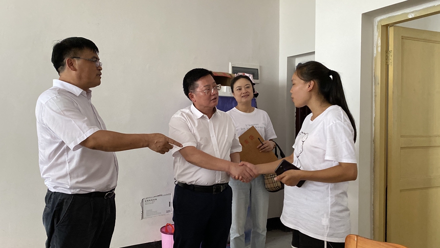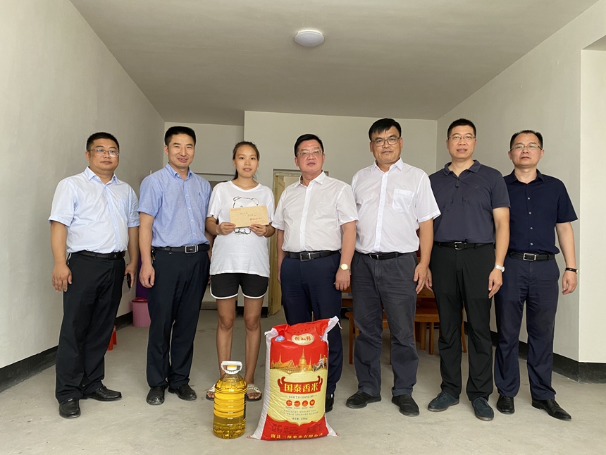 在师大驻村帮扶工作队队长郑阳辉、关峡乡党委书记龙景星的陪同下,黄月初、陈迪勋一行首先来到帮扶对象周云香家中。周云香的爱人苏知平因常年患病导致家庭贫困,苏知平去世后,在党和政府的关心下,在附中的帮扶下,全家完成了异地搬迁,从山窝窝里搬到了政府新盖的楼房,住进了新家。在周云香家中,黄月初送上了学校的慰问金和慰问物资,周云香的女儿代表外出打工的母亲表达了对附中的感激之情,感谢学校一直以来对她们家庭的关心和帮扶,特别感谢学校安排她弟弟在食堂工作,并欣喜地看到弟弟在附中工作期间的变化与成长,她表示要把日子越过越好,不辜负学校对她们全家的帮扶和期望。