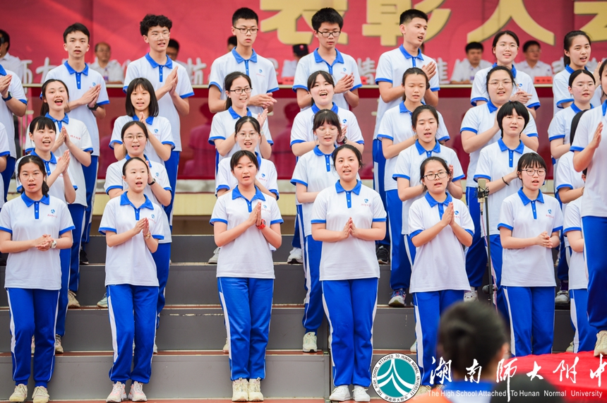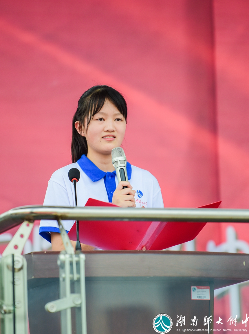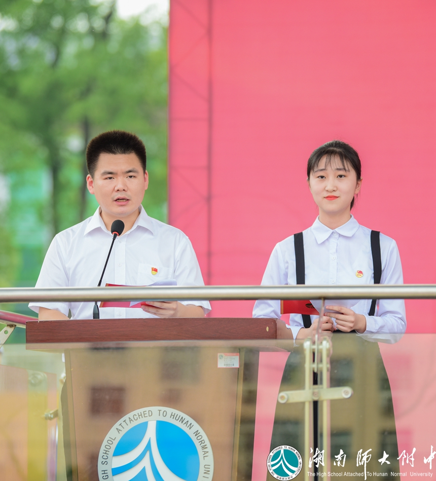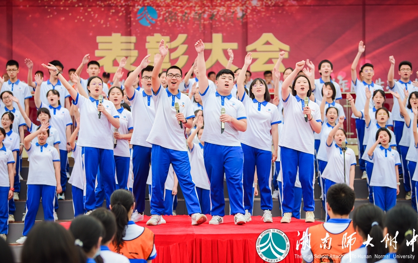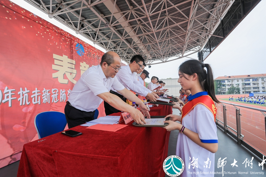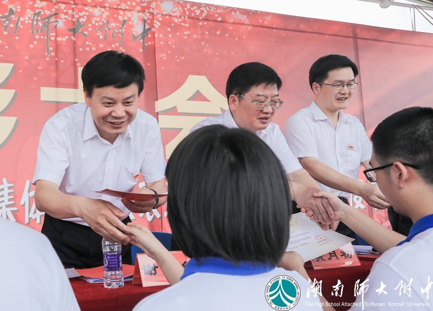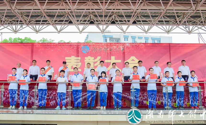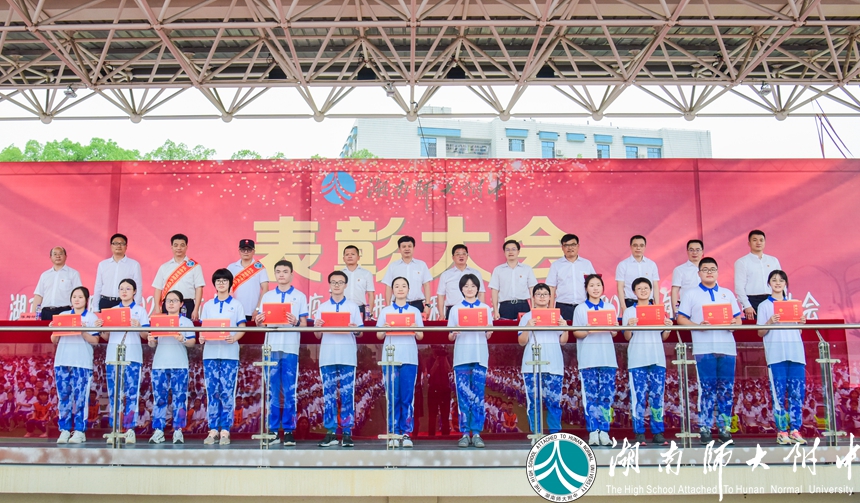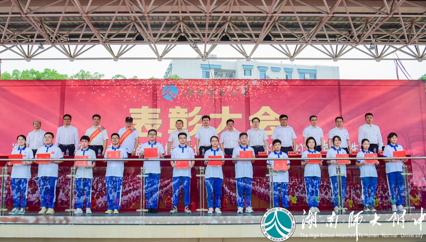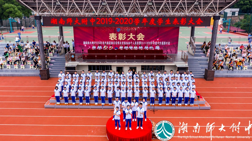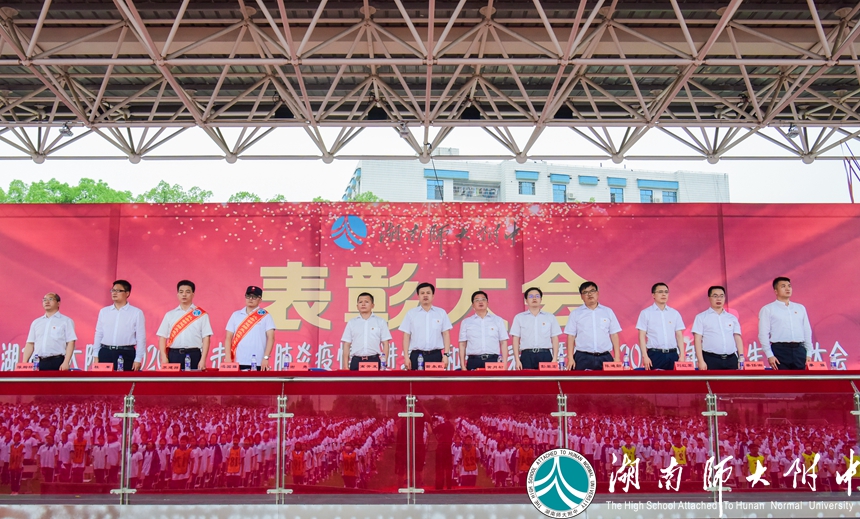 5月27日下午,湖南师大附中2019-2020学年度学生表彰大会在田径场隆重举行。校长谢永红,党委书记黄月初,党委副书记彭荣宏,副校长兼工会主席陈迪勋,副校长苏建祥、蔡任湘、杜军(挂职),党委委员、校长助理廖强,党委委员、校长助理陈胸怀等校领导,法治副校长谢勇,洪山集团执行董事高开发,校友冯国强,校家委会副主任刘红荣等嘉宾出席大会并担任颁奖嘉宾。大会由团委书记李钊、1807班李诗绪主持。