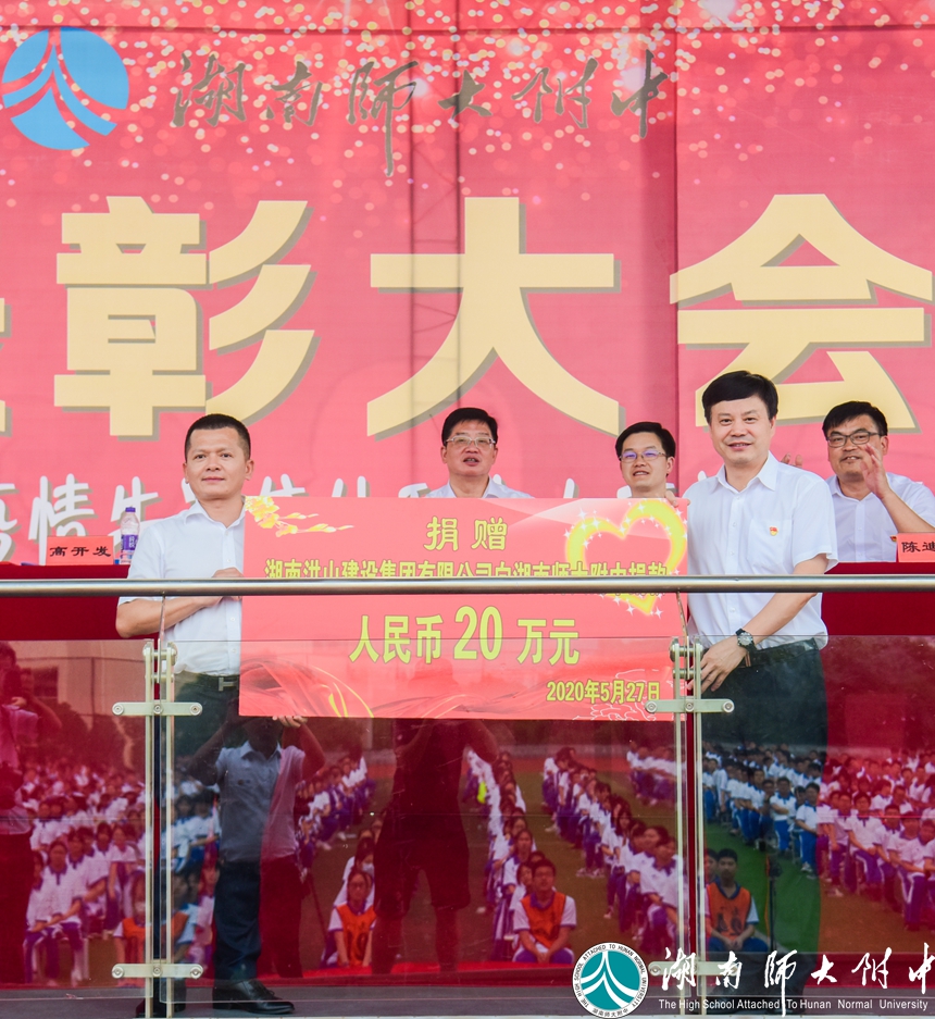 在激昂的国歌声中,大会拉开了序幕。湖南洪山集团执行董事高开发先生代表洪山集团向我校捐赠20万元,设立“洪山建设奖”,奖励附中的优秀师生,谢永红代表学校接受捐赠。
