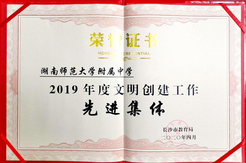2019年11月,湖南省文明办对2017年表彰的我省第一届全国文明校园进行了督导检查,我校再次以总分全省第一的好成绩顺利通过全国文明校园年度测评复查。