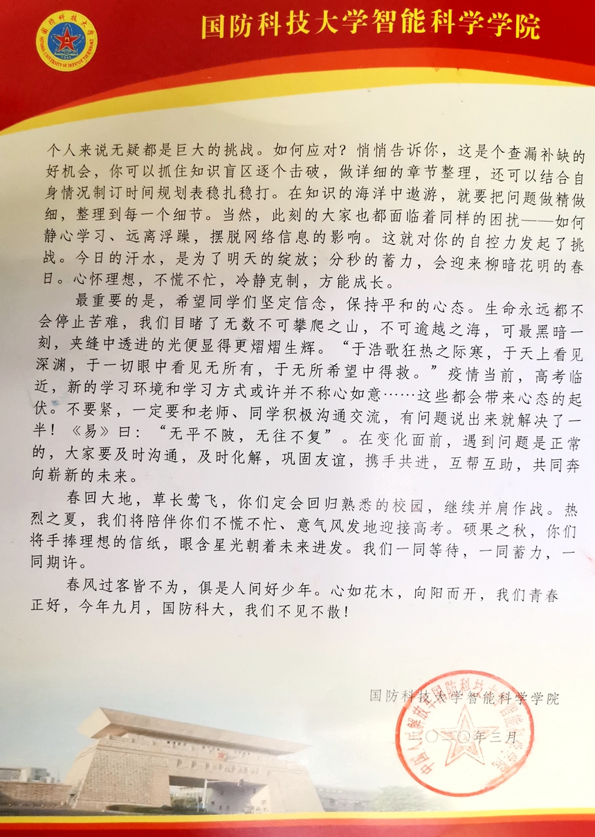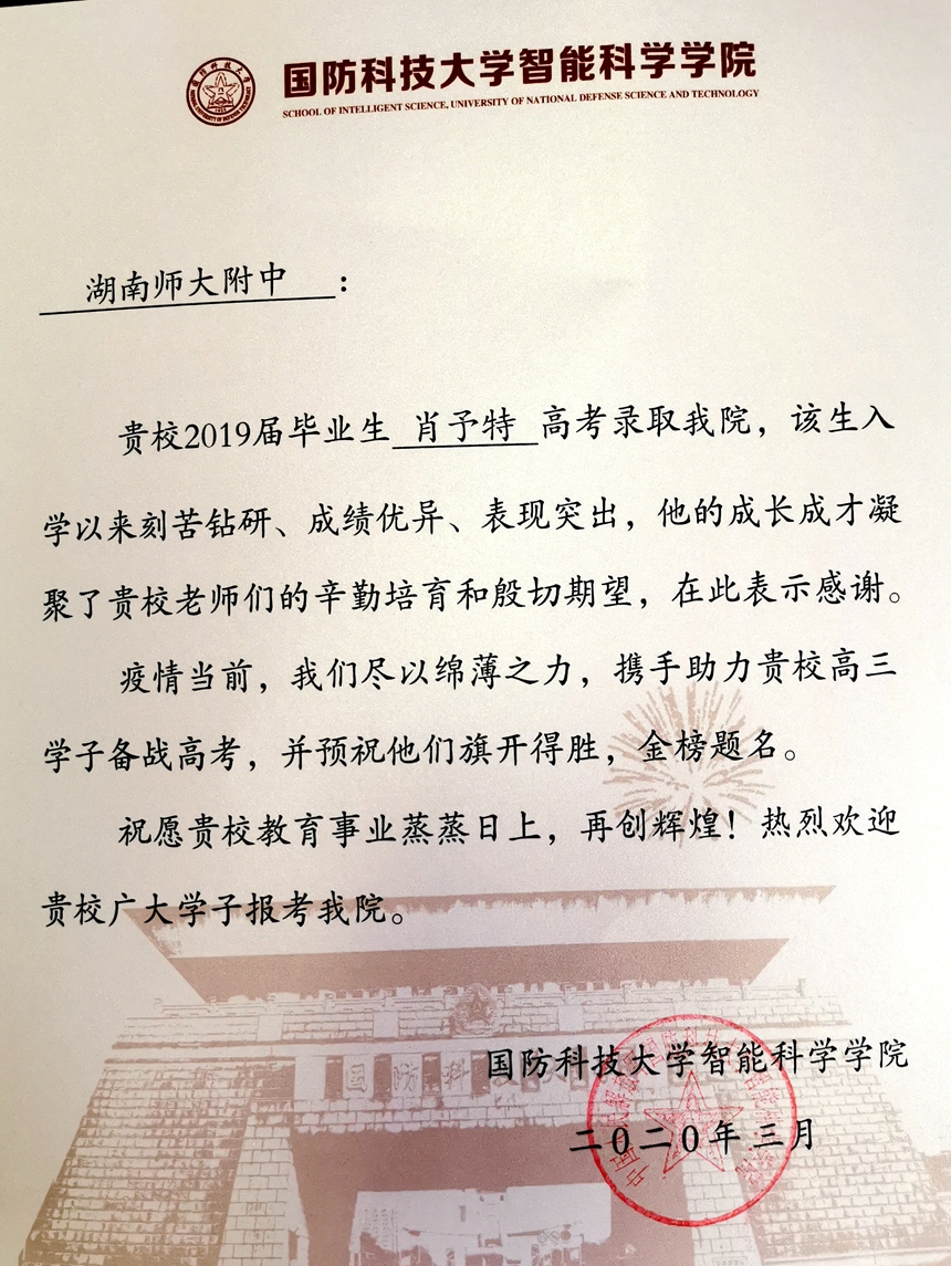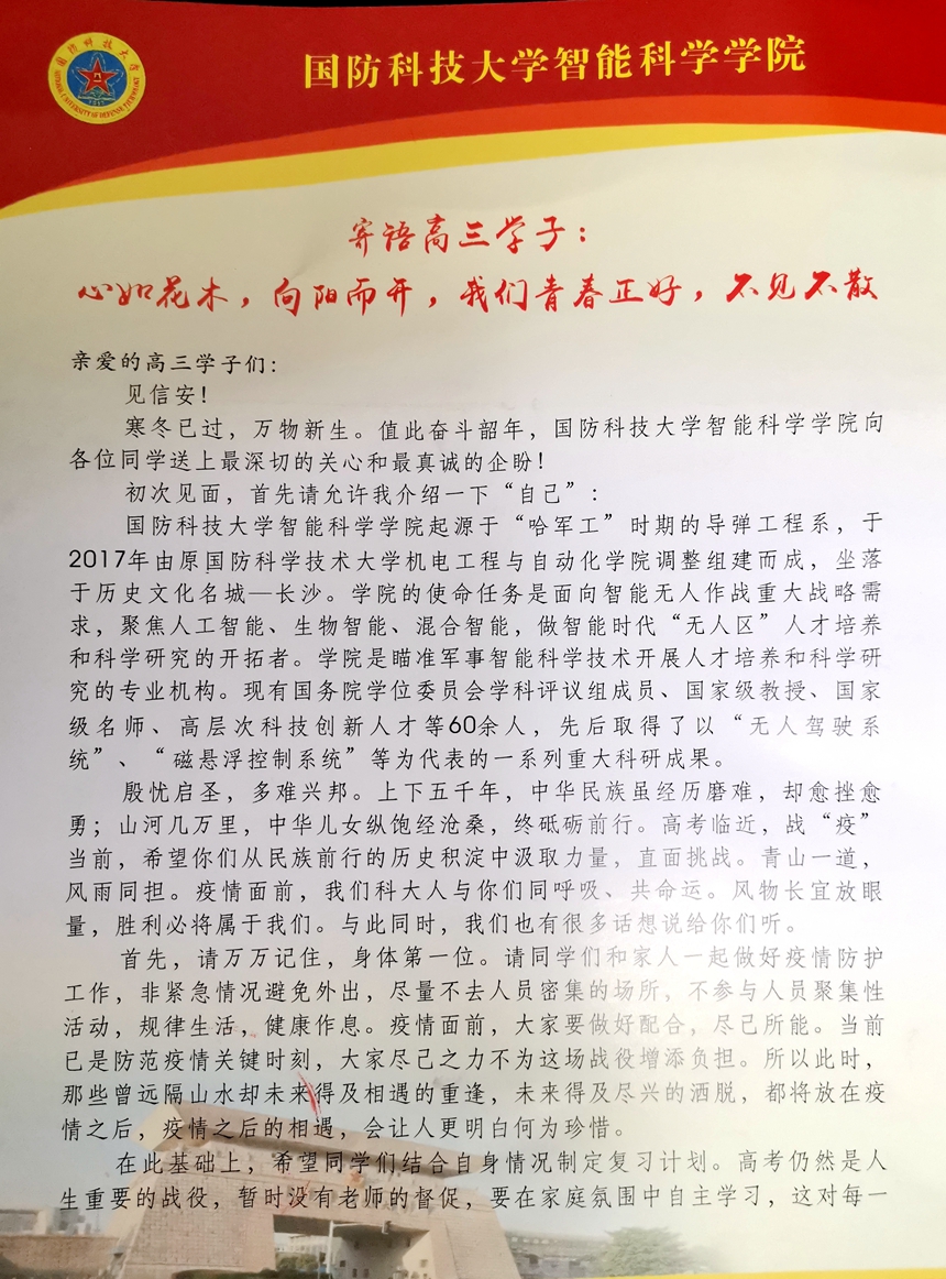 春回大地,草长莺飞,同学们回归熟悉的校园,继续并肩作战。近日,国防科技大学给高三的同学们送来了2000个医用口罩,助力高三学子备战高考,另附感谢信一封,我校培养的2019届毕业生肖予特在国防科大入学以来刻苦钻研、成绩优异、表现突出,感谢我校老师们的辛勤培育。