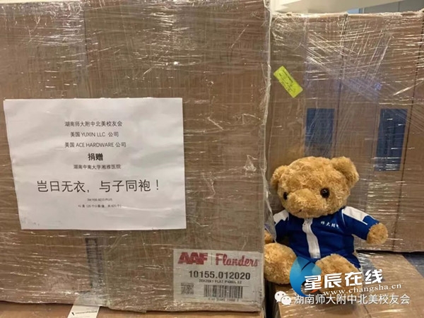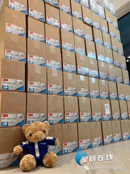 (湖南师大附中北美校友会筹集7千只口罩赠送给中南大学湘雅医院。)