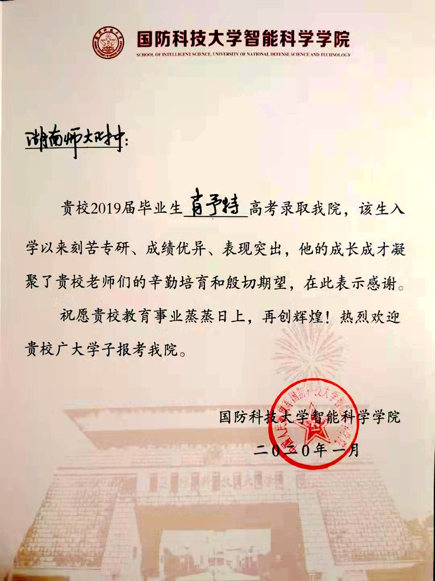 1月18日,国防科技大学送来感谢信,称我校2019届毕业生肖予特同学在国防科技大学成绩优异、表现突出,特致信感谢我校对该生的培养和教育。