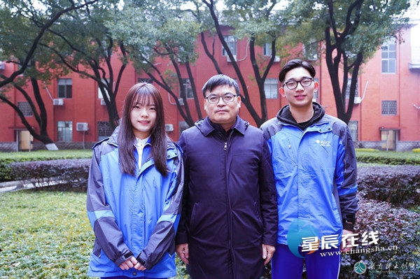 (蒋品与覃泽众与湖南师大附中高三年级组组长李勇合影。)