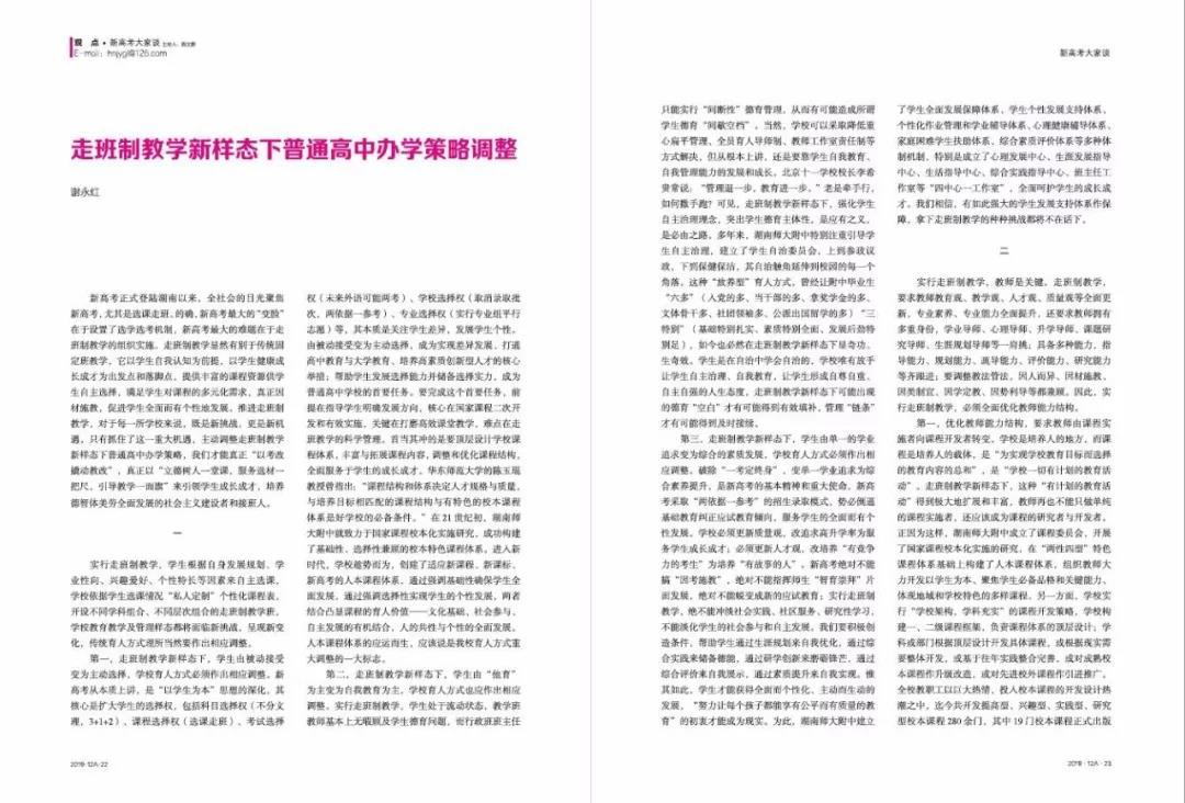 新高考正式登陆湖南以来,全社会的目光聚焦新高考,尤其是选课走班。《湖南教育》2019年12月A版刊发了我校校长谢永红的文章《走班制教学新样态下普通高中办学策略调整》,全文收录如下: