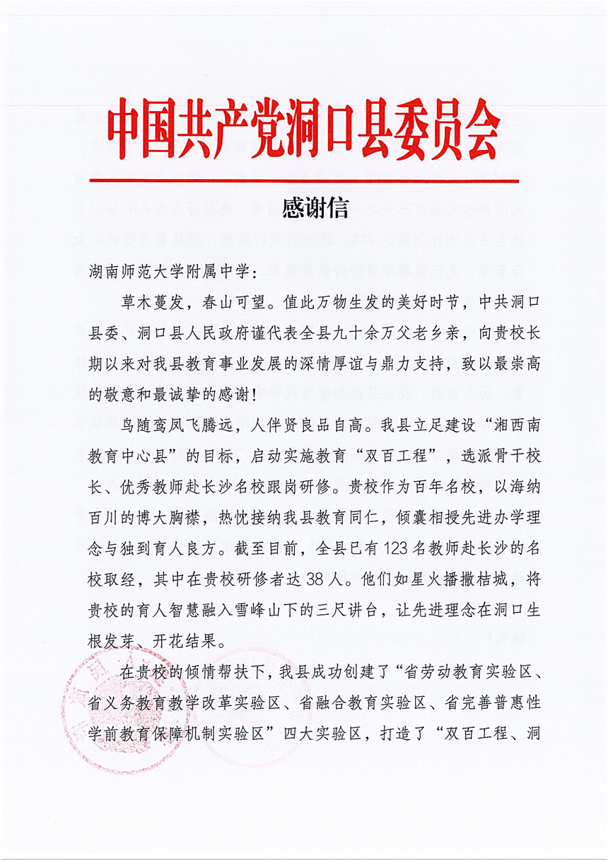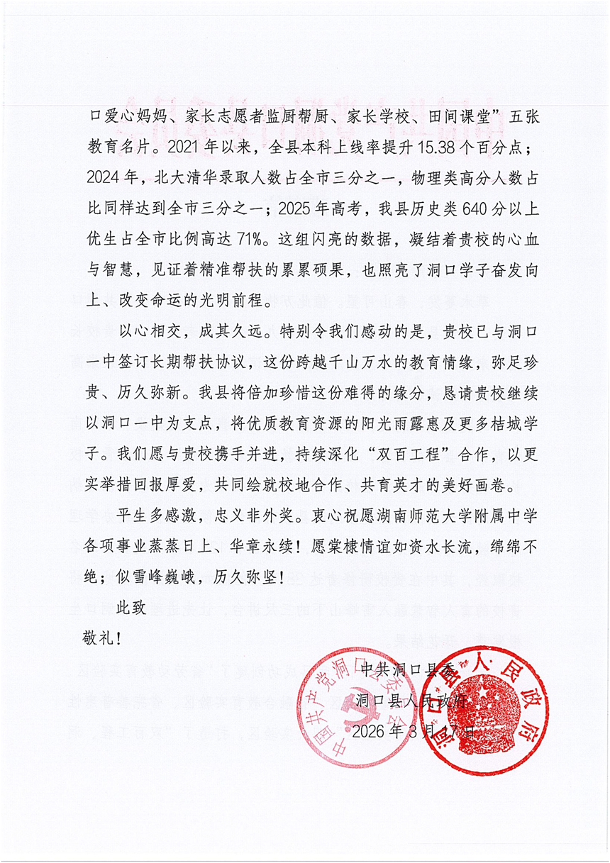 洞口县委副书记、统战部长郭向荣宣读县委、县政府致我校的感谢信。吴韬表示,洞口教育实现从“跟跑”到“并跑”的跨越,离不开我校的真情帮扶,赴校研修的教师成为当地教育提质的骨干力量,真正实现“一人学习、全体受益、全域提升”,下一步洞口县将健全长效机制,持续放大帮扶效应。