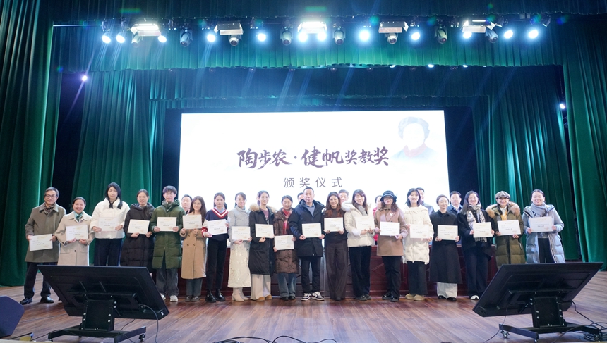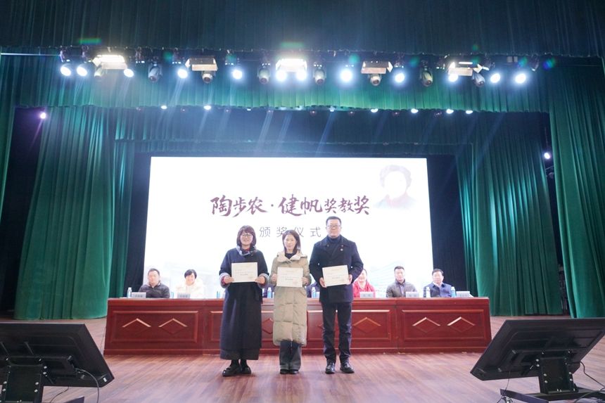 副校长廖强宣读《关于2025年度教育教学成果奖的表彰决定》。大会依次为高 2025 届教育教学成果奖、高2023 级教育教学成果奖、初2025届教育教学成果奖、学科竞赛指导奖优秀代表、优秀课题奖及“陶步农・健帆”奖教奖获得者颁奖。黄钢、严志、陈婕、李艳四位获奖教师代表依次上台发言,分享了教学心得与育人感悟。