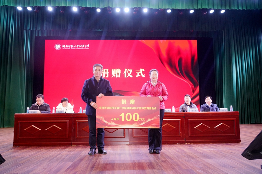 大会现场举行捐赠仪式。北京天申科技有限公司向学校捐赠100万元,助力学校基础设施建设与教育教学发展。