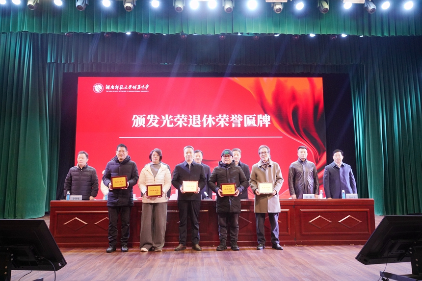 校长苏建祥宣读《关于向姜建平等14位同志授予“光荣退休”荣誉匾牌的决定》,并为 14 位退休教职工颁发荣誉匾牌。退休教师代表朱蔚老师发言,她深情回顾了在附中的从教生涯,表达了对教育事业的热爱与坚守,以及对学校未来发展的美好祝愿。