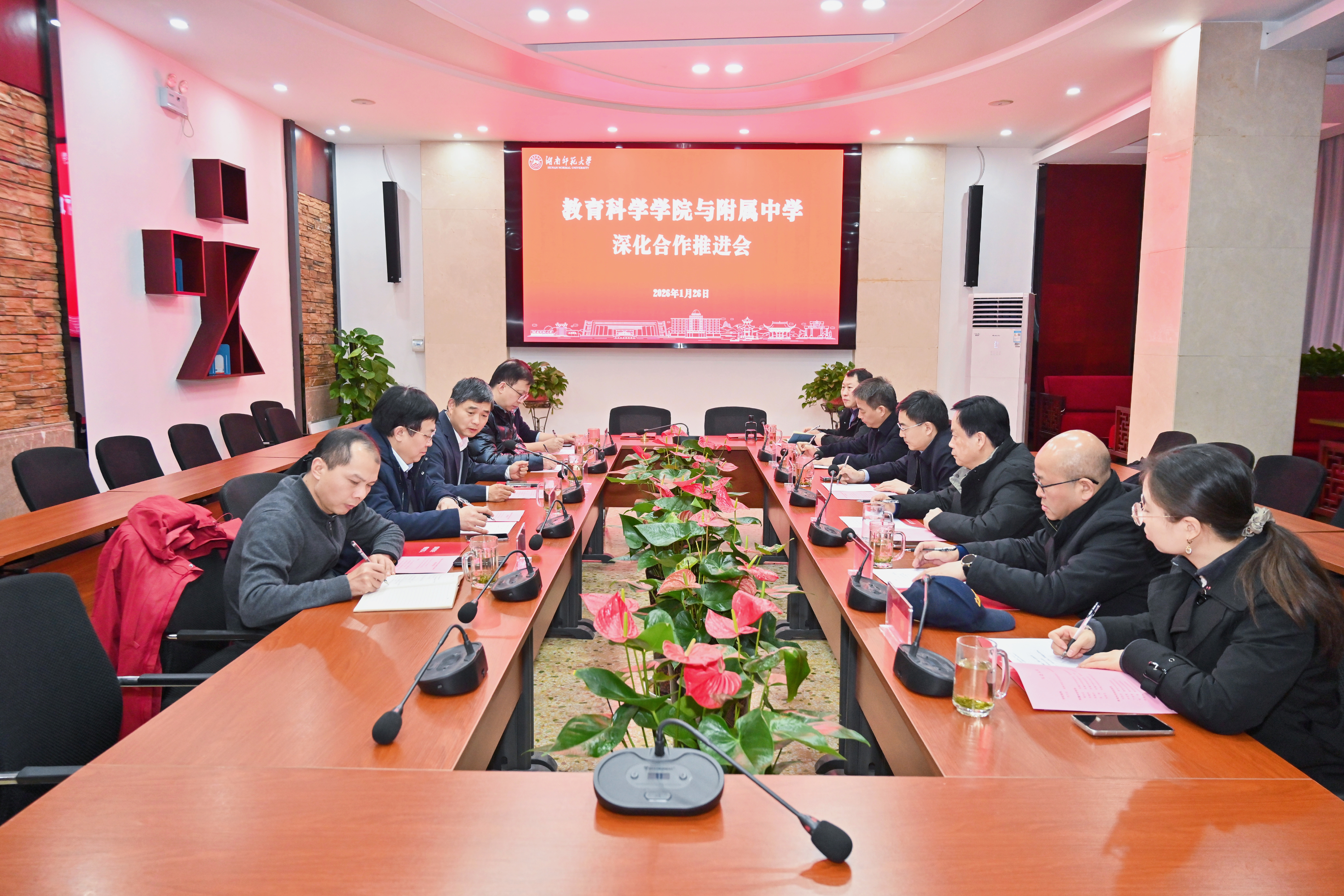 1月26日下午,我校与湖南师范大学教育科学学院深化合作推进会在教科院七楼会议室举行。湖南师范大学党委委员、组织部部长沈又红;我校党委书记谢永红,校长苏建祥,副校长陈胸怀;教科院院长刘铁芳,副院长丁道群、赵亮及双方相关部门负责人出席会议。会议由教科院党委书记向发意主持。