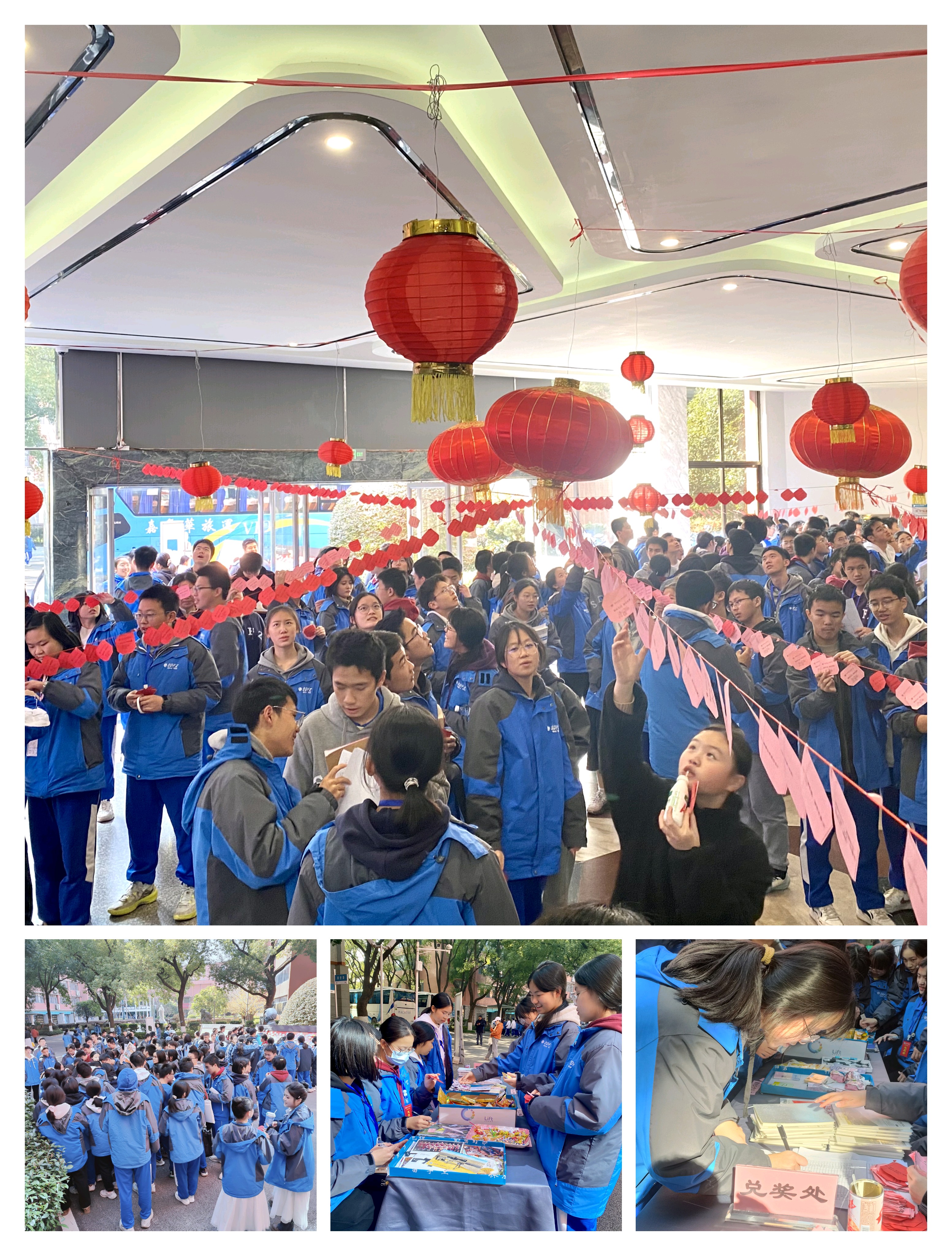 现场以新春喜乐为主题布置,数十盏红灯笼高悬,千余幅红谜卡缀于彩色长绳,铺满大厅,节日文化氛围浓厚。猜谜现场欢声笑语、气氛热烈,师生或驻足沉思、或结伴探讨,传统灯谜与英语谜语相映成趣。兑奖处暖意融融,明信片、书签、暖手贴等丰厚奖品备受青睐,答对 10 题以上的 37 名同学还获颁专属证书。其中高 2319 班李晴、高 2401 班谭淞瀚与陈浩宇同学答对 21 题,师大附小程宇浚同学答对 12 题,表现亮眼。