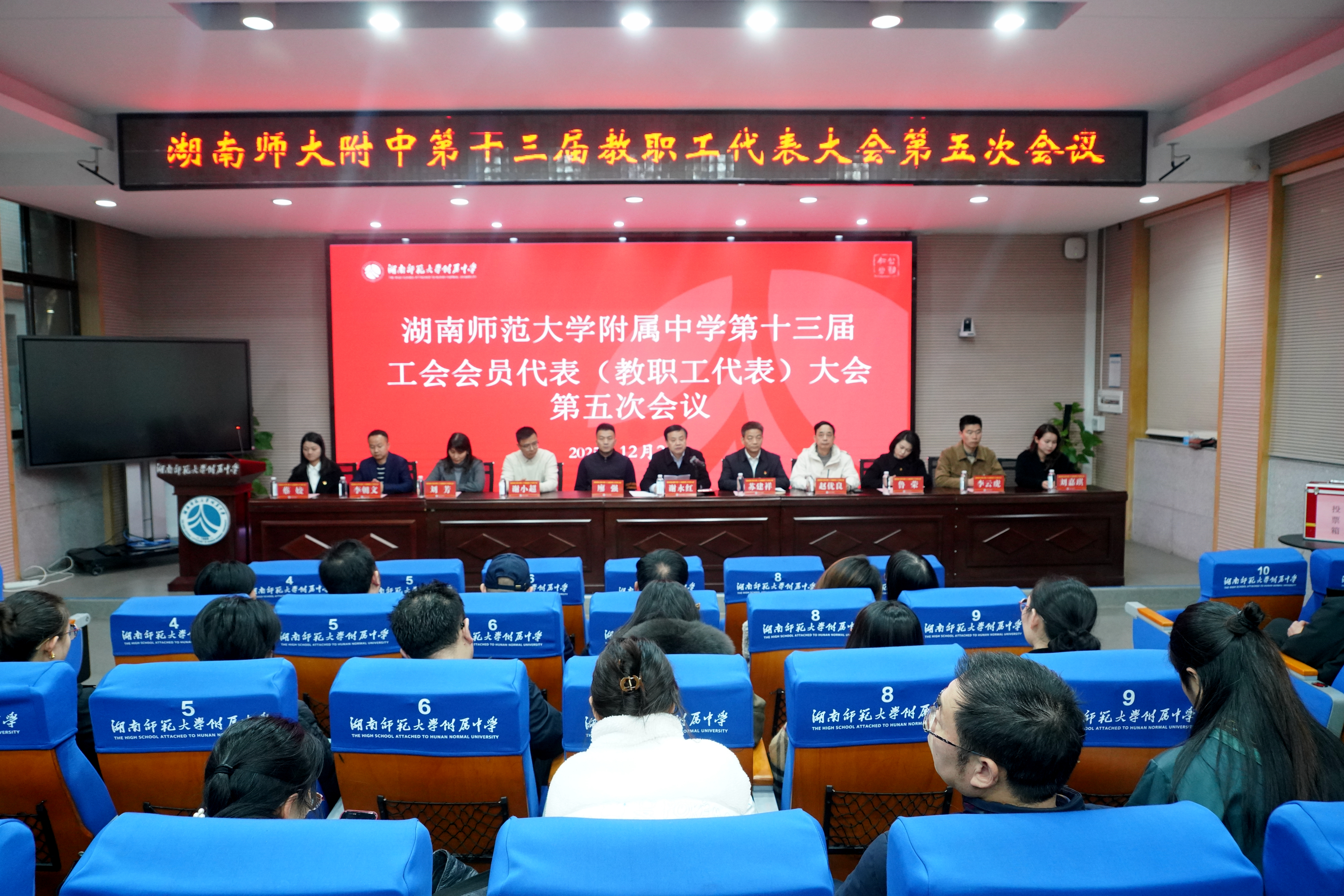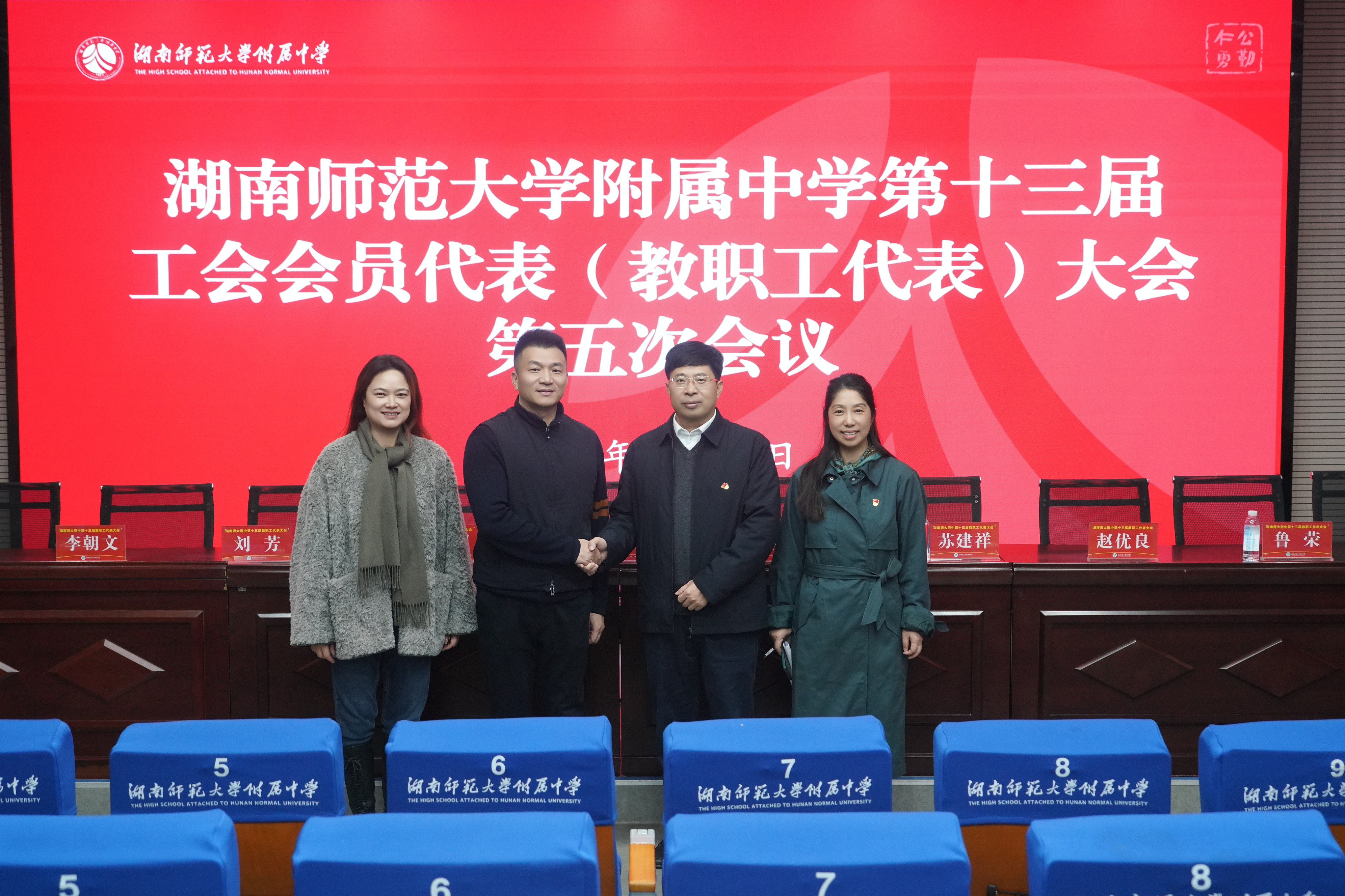 大会在庄严的国歌奏唱声中拉开帷幕。会上,谢永红宣读了湖南省教育工会《关于湖南师范大学附属中学工会主席、副主席候选人的批复》,随后大会表决通过选举办法与选举工作人员名单。校长苏建祥介绍了候选人基本情况。经全体代表民主投票,选举许小平为第十三届工会委员会主席、苏晓玲为副主席。新当选的工会主席许小平作表态发言,表示将以 “服务教职工、助力学校发展” 为核心,从坚持正确方向、竭诚服务职工、加强民主管理、提升履职能力四方面认真履职,致力于把工会建成教职工信赖的 “职工之家”。
