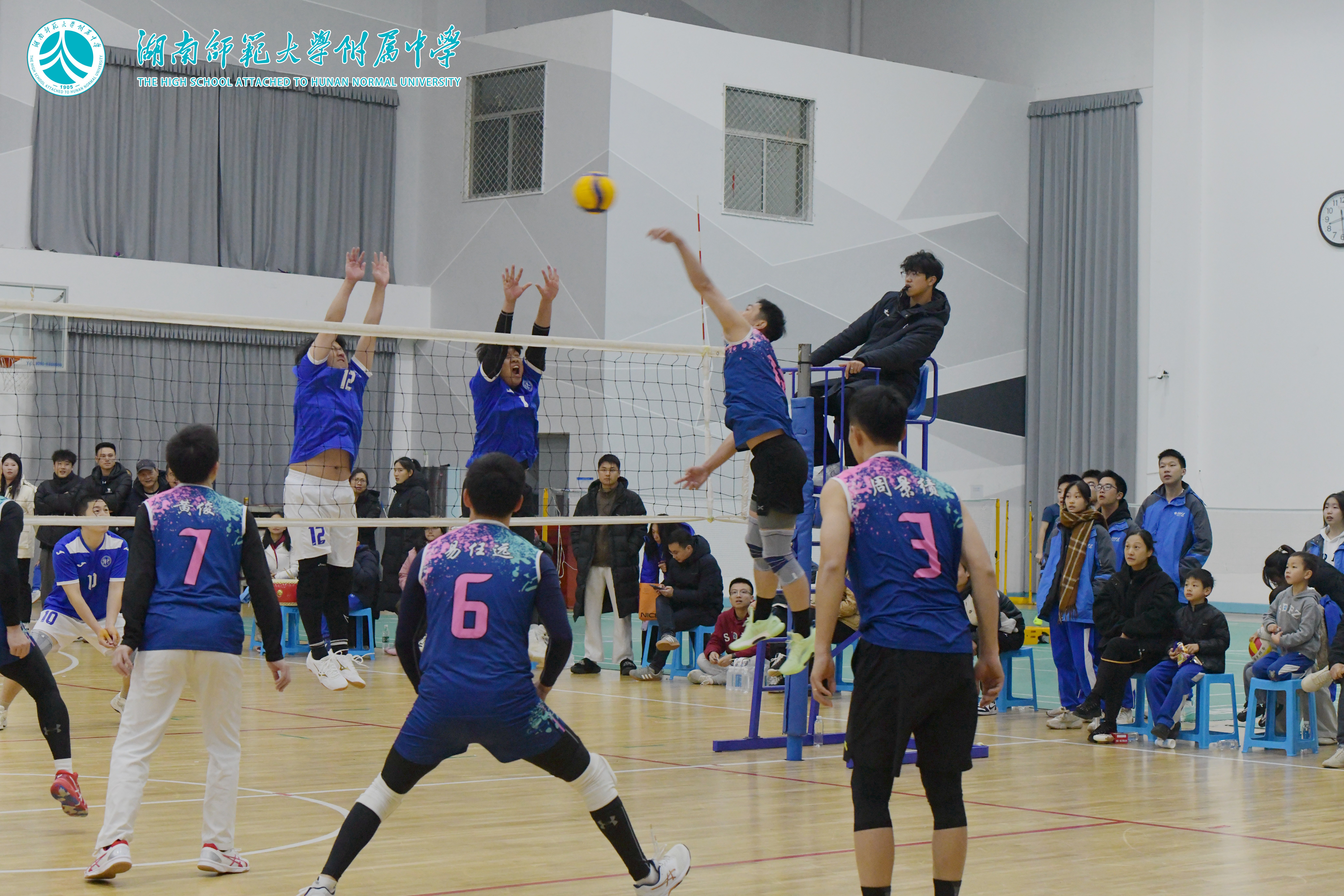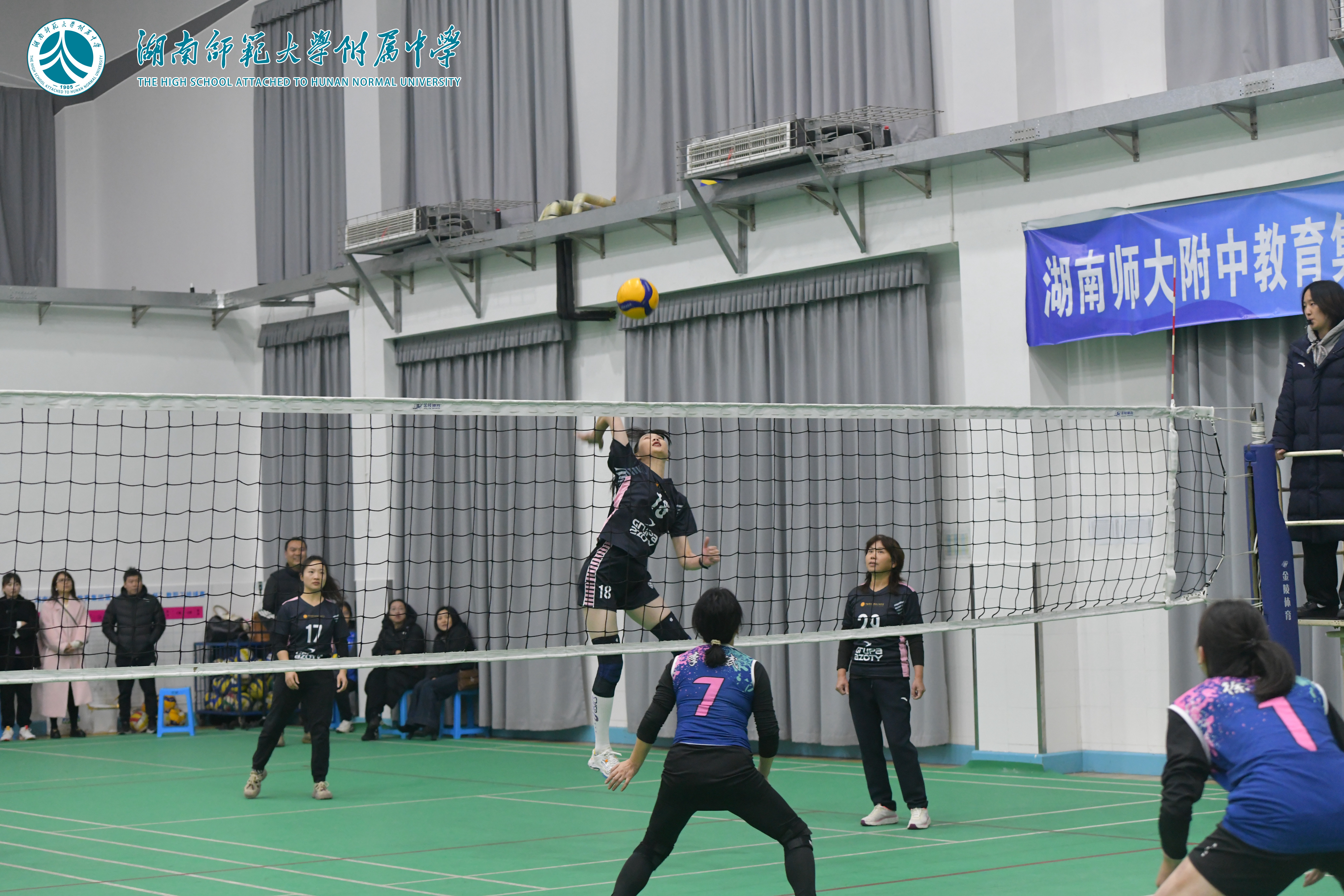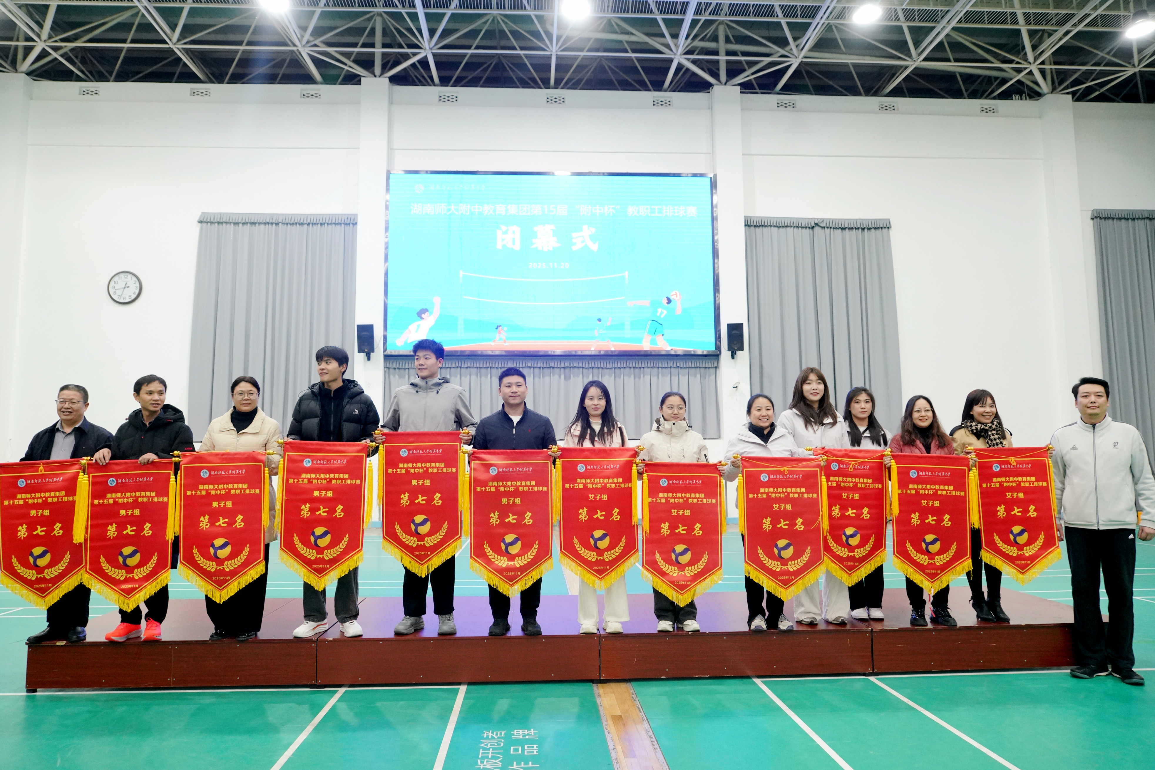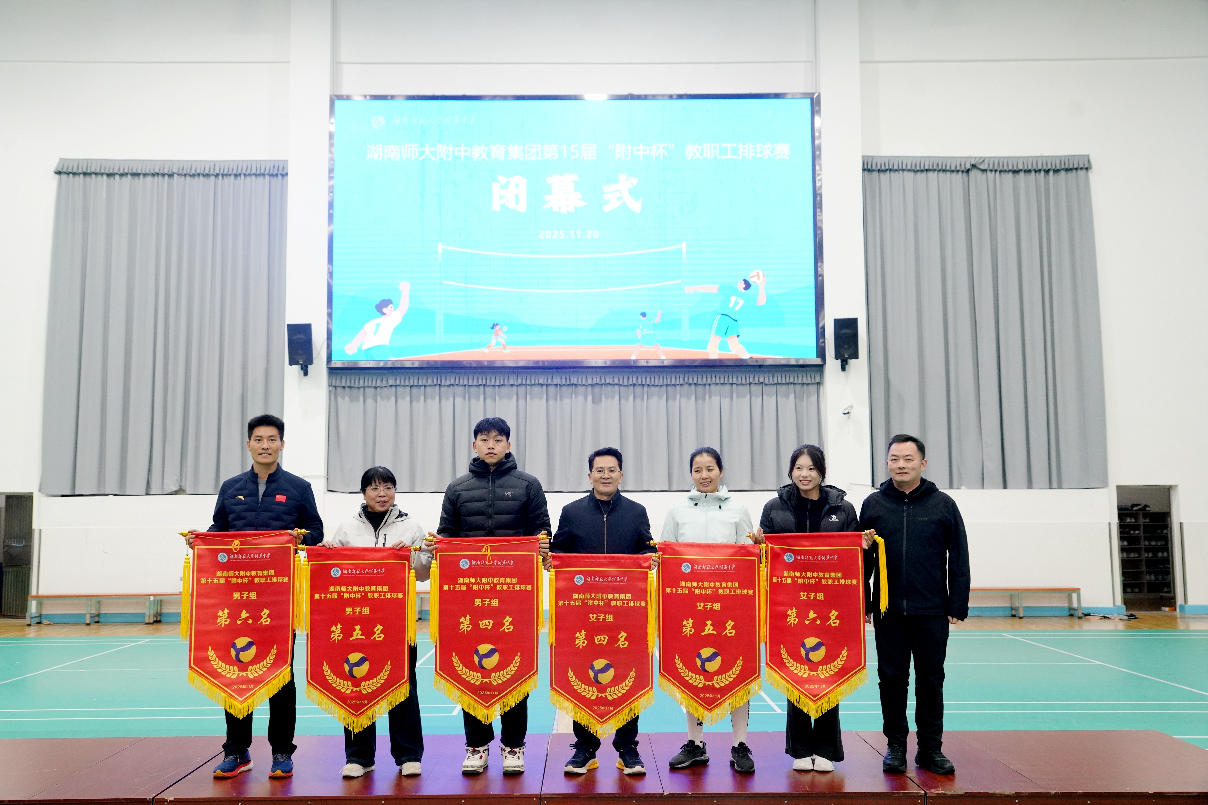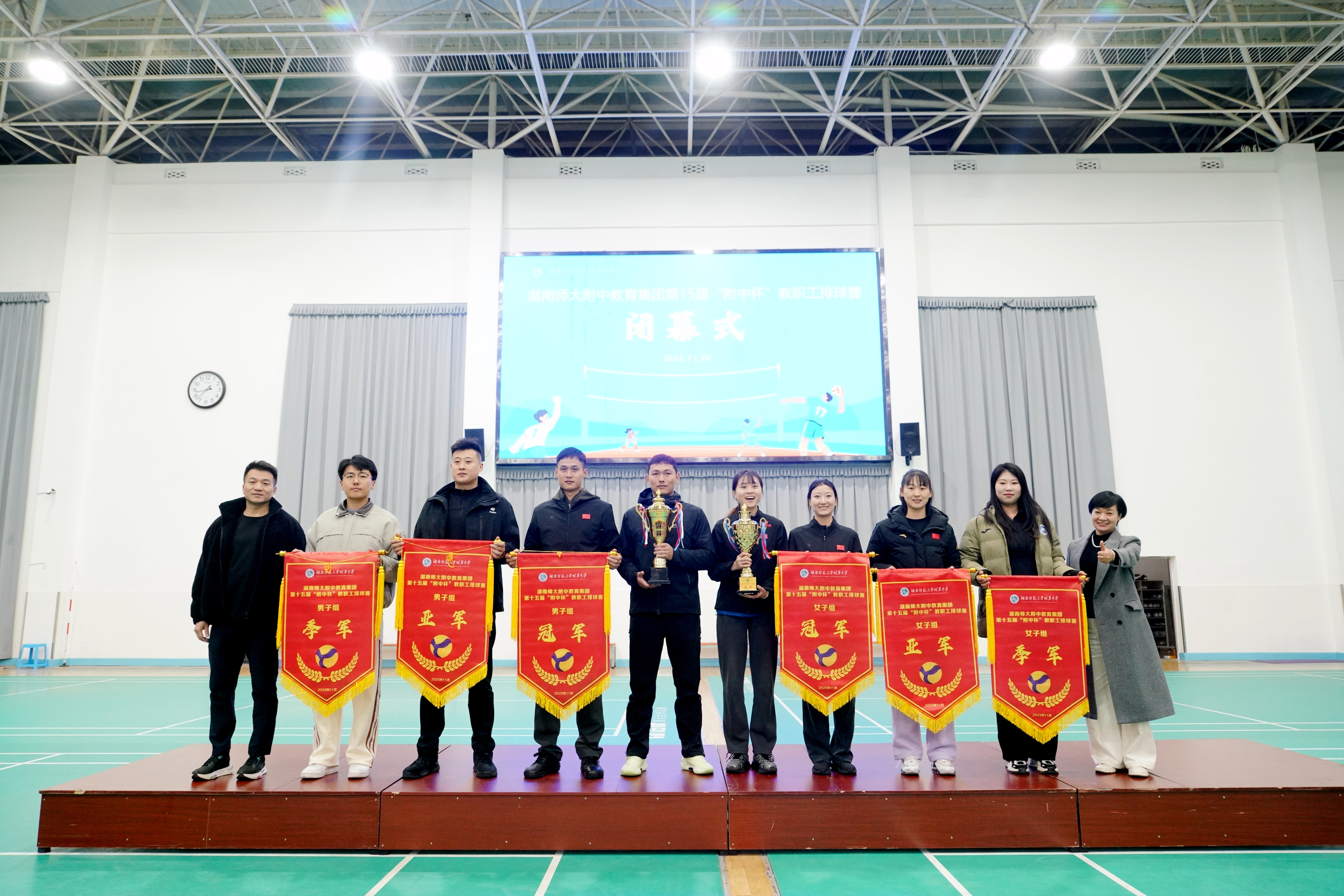 11月20日晚,湖南师大附中教育集团第十五届“附中杯”教职工排球赛在桃子湖校区任邦柱体育馆圆满落下帷幕。经过一周激烈角逐,湖南师大附中代表队表现卓越,包揽男子组、女子组双料冠军,附中博才实验中学分获男子组亚军、女子组季军,附中梅溪湖中学夺得女子组亚军。