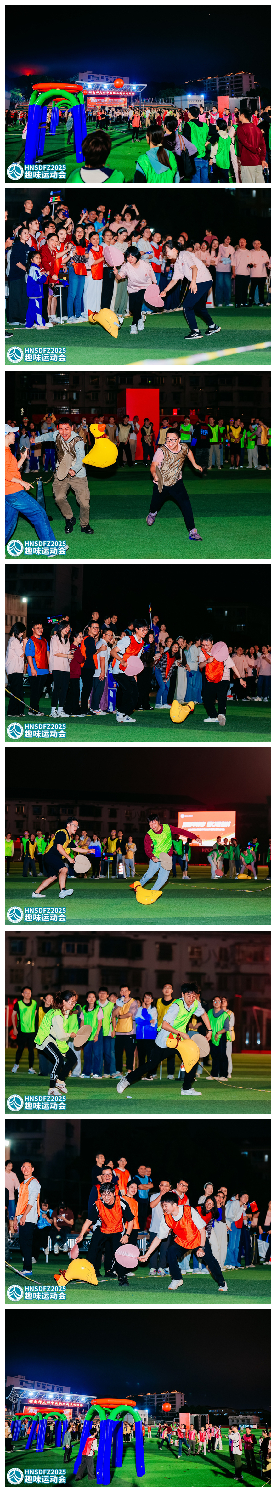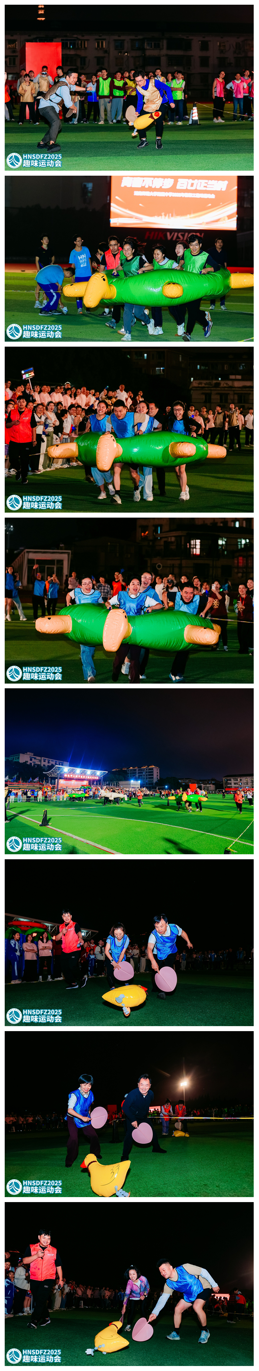 本次运动会以“轻松参与、快乐竞技、团结奋进”为核心宗旨,设置了赶大鹅、灌篮高手、龟兔赛跑、足球九宫格、枕头大战五个集体项目,兼顾趣味性与协作性,吸引了全体教职工积极参与。各参赛队伍提前组建团队,推选领队与教练,利用课余时间开展针对性训练,为比赛做好充分准备。 当晚18:30,各队伍陆续抵达赛场完成签到检录,队员们精神饱满、斗志昂扬,统一的着装彰显了团队的凝聚力。19:00,随着裁判哨声响起,运动会正式拉开帷幕。赶大鹅项目中,男女搭档默契配合,用扇子巧妙引导充气鹅接力前行,赛道上不时响起阵阵欢呼;灌篮高手赛场,队员们精准投射、快速传球,在两分钟内全力冲刺进球数量;龟兔赛跑环节,各队队员同心协力抬起道具,迈着整齐的步伐向终点奋进,充分展现了团队协作的力量;足球九宫格前,教职工们精准发力,瞄准分值区域踢出每一脚,考验着技巧与判断力;枕头大战更是将现场气氛推向高潮,大家在规定区域内尽情投掷,释放工作压力,赛场变成了欢乐的海洋。
