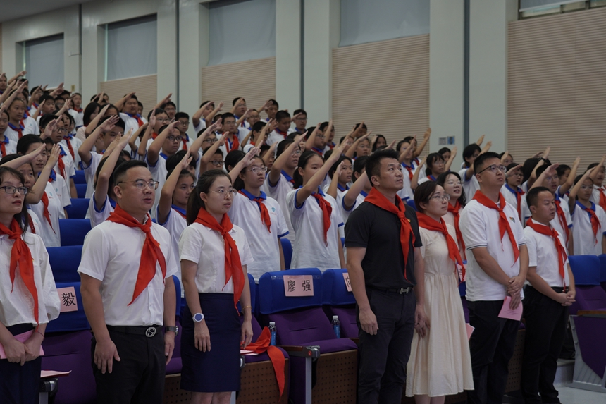 队员们举起右拳,在大队长薛可依带领下重温入队誓词,向着队旗庄严宣誓。