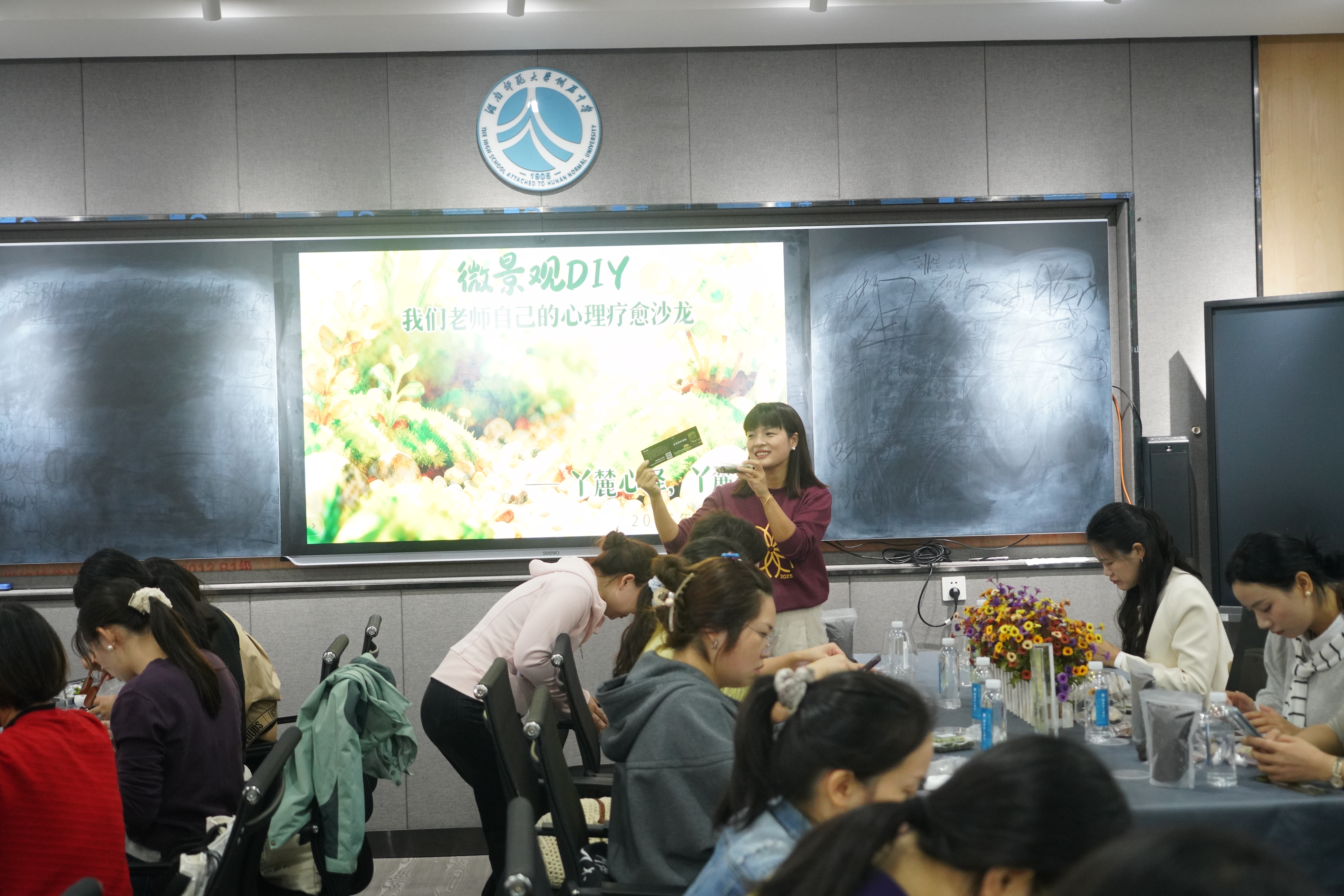 在“微景观DIY手作与自我关怀”环节,教师们利用材料包进行创作,体验心流状态,感受手工制作带来的放松与乐趣。该环节有效缓解了工作压力,增强了教师的自我觉察与心理滋养能力。