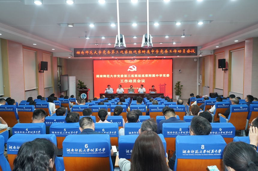 湖南师范大学党委办公室主任、巡察办公室主任罗常军,湖南师范大学党委第三巡察组副组长刘晓燕及有关同志出席会议, 学校领导班子成员、中层管理干部、外派集团校干部代表、教师代表、离退休人员代表参加会议。