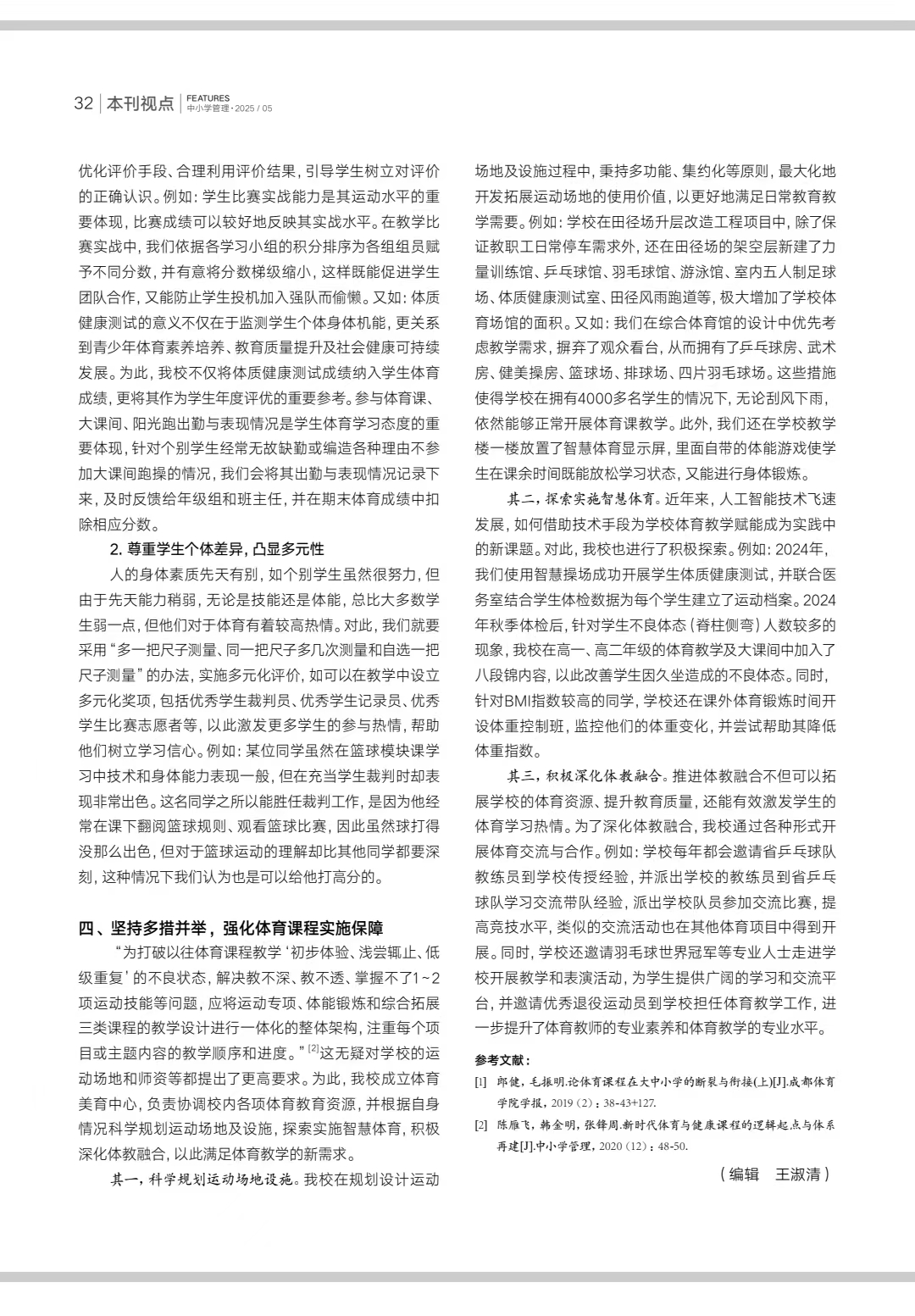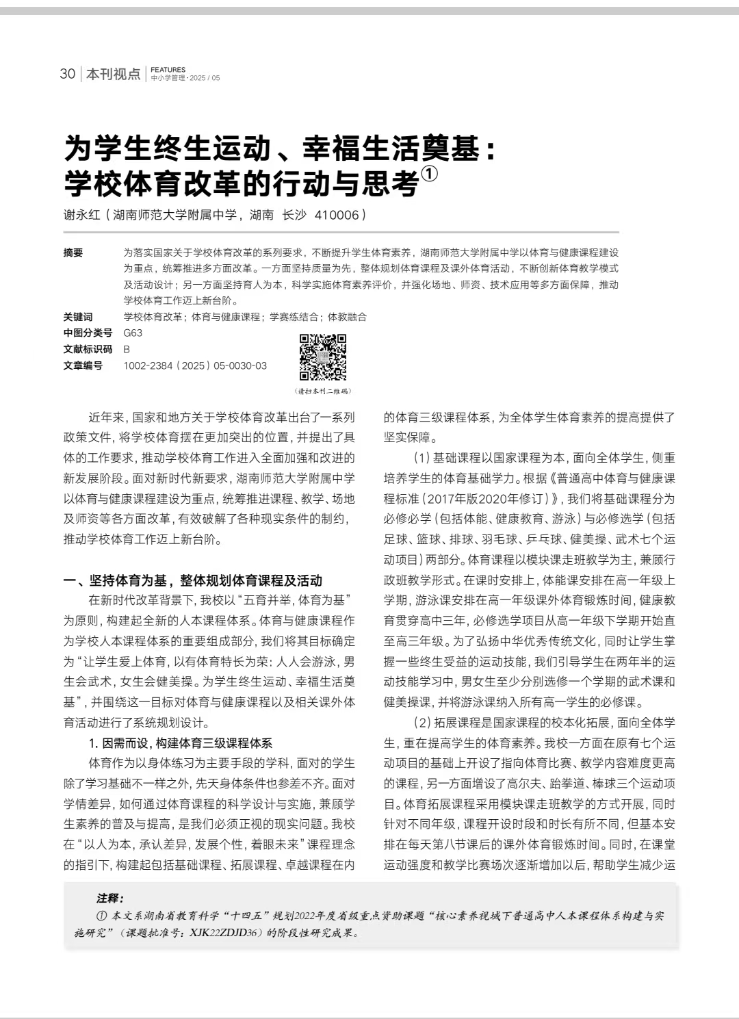 近日,《中小学管理》2025年第5期刊发我校党委书记谢永红文章《为学生终生运动、幸福生活奠基:学校体育改革的行动与思考》,推介我校体育改革实践及成效。现全文转载如下: