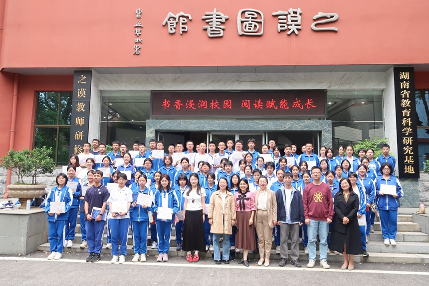 语文组江腾老师对同学们的精彩分享表示赞赏,并鼓励大家继续深入阅读,不断拓宽视野,提升文学素养。随后,活动举行了颁奖仪式,对在阅读分享和配音大赛中表现突出的同学进行了表彰,参加阅读分享会的全体老师和学生在之谟图书馆阶梯处合影留念。