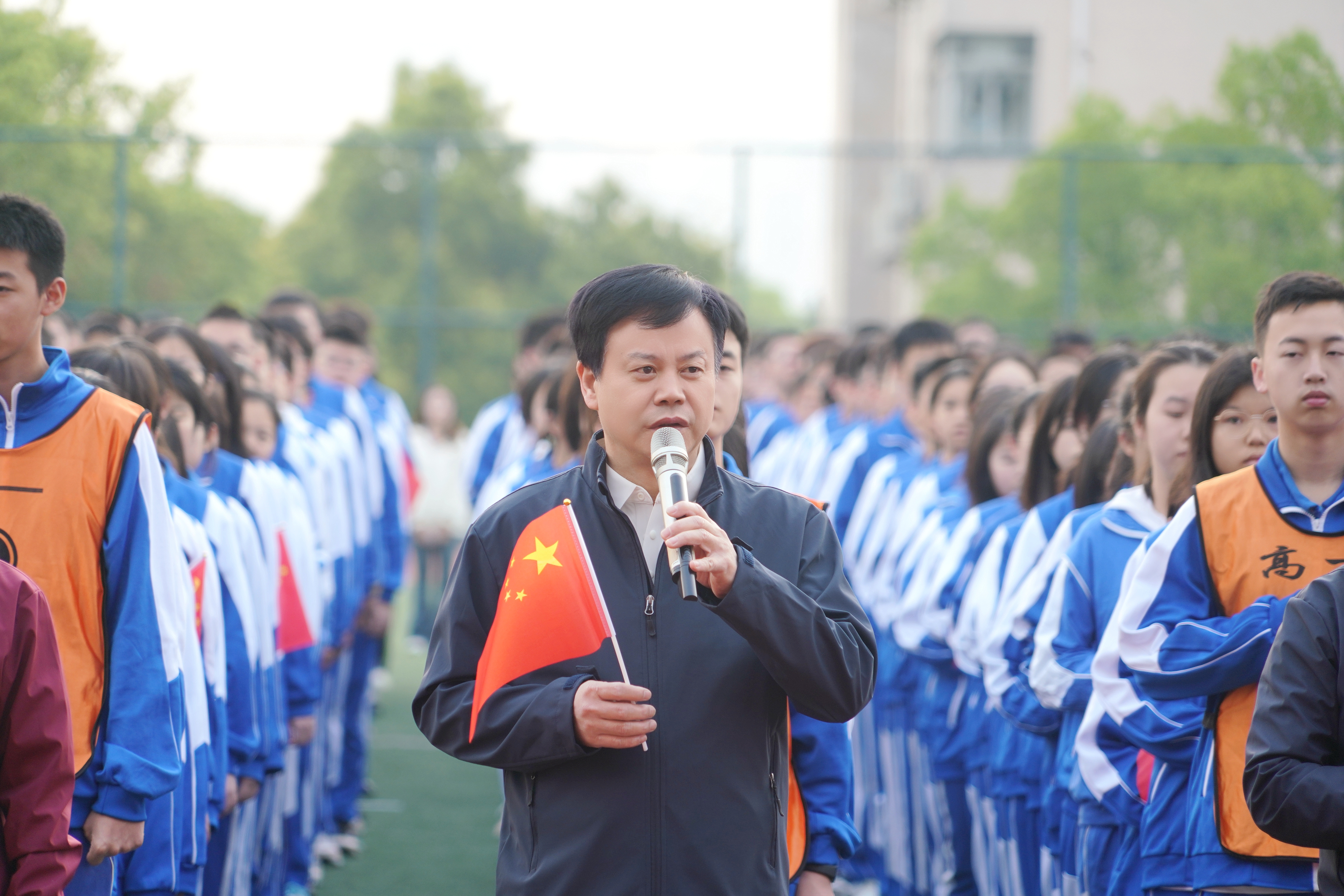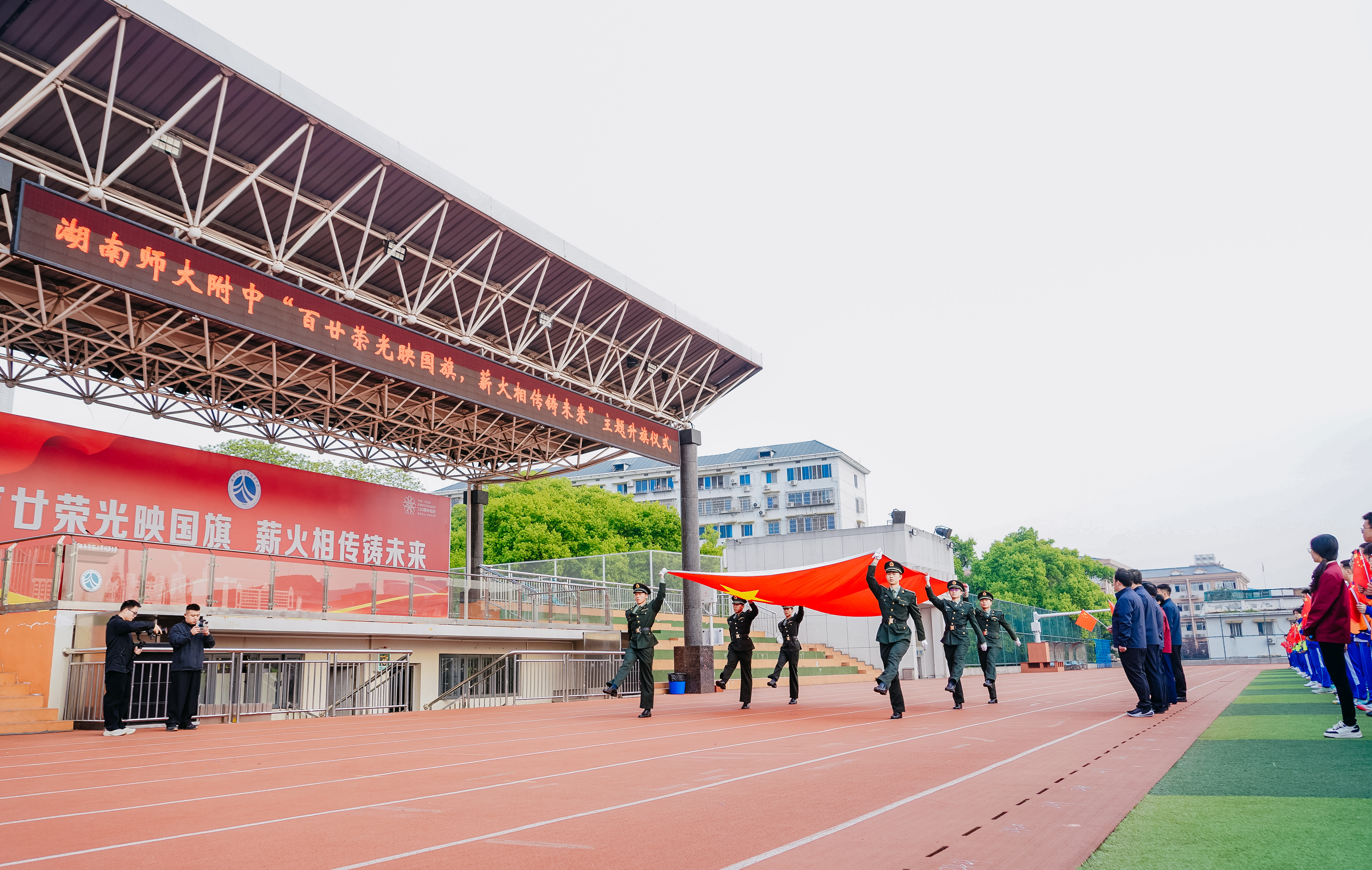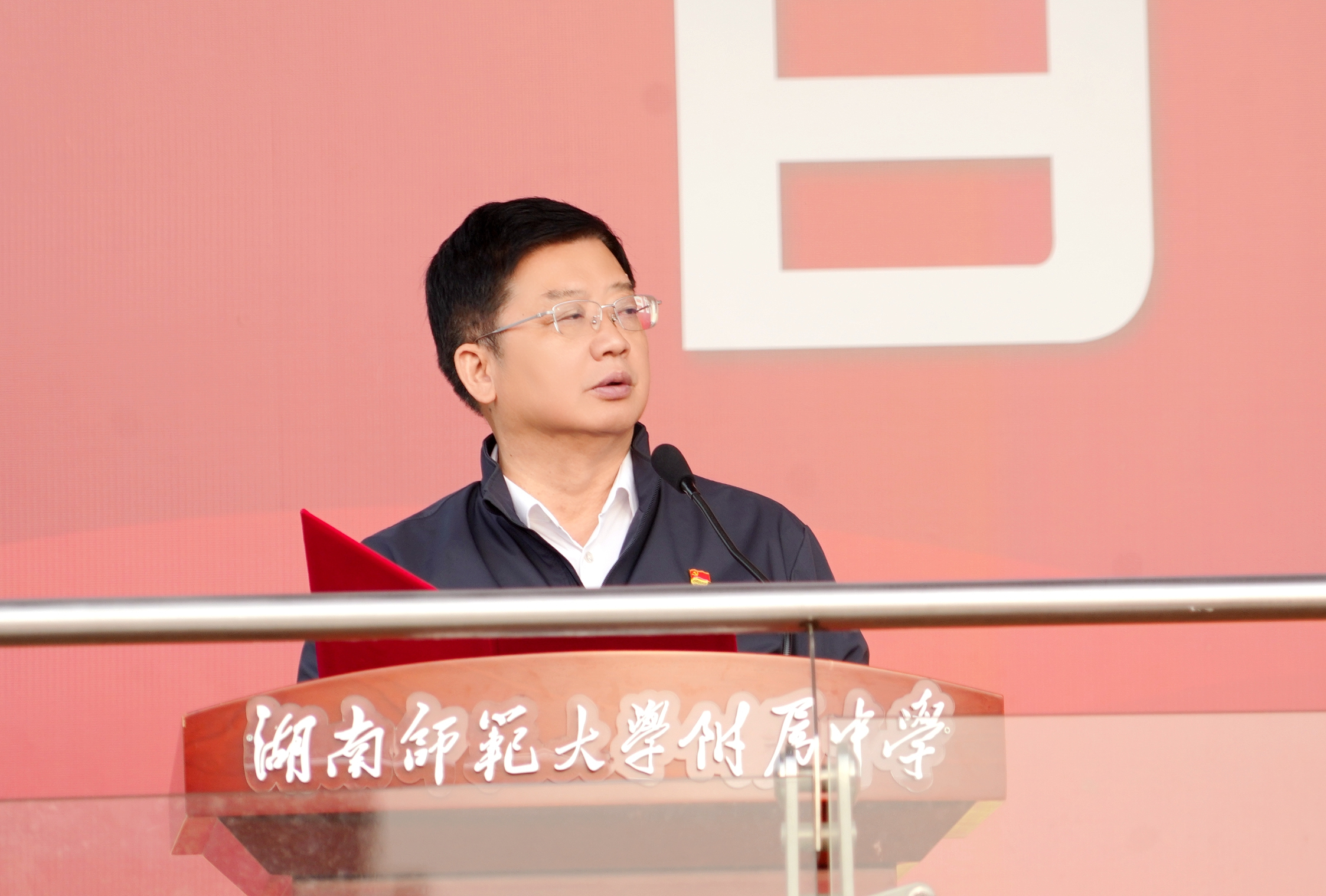 黄月初做题为《国旗荣光映百廿,青春奋进续华章》的思政课。他表示,我校获赠天安门国旗是湖南师大附中发展史上的里程碑大事,这完全得益于我校优良的革命传统和卓越的办学成绩。他期待,同学们努力成为德智体美劳全面发展的社会主义建设者和接班人。用附中答案回答世界之问和时代之问。