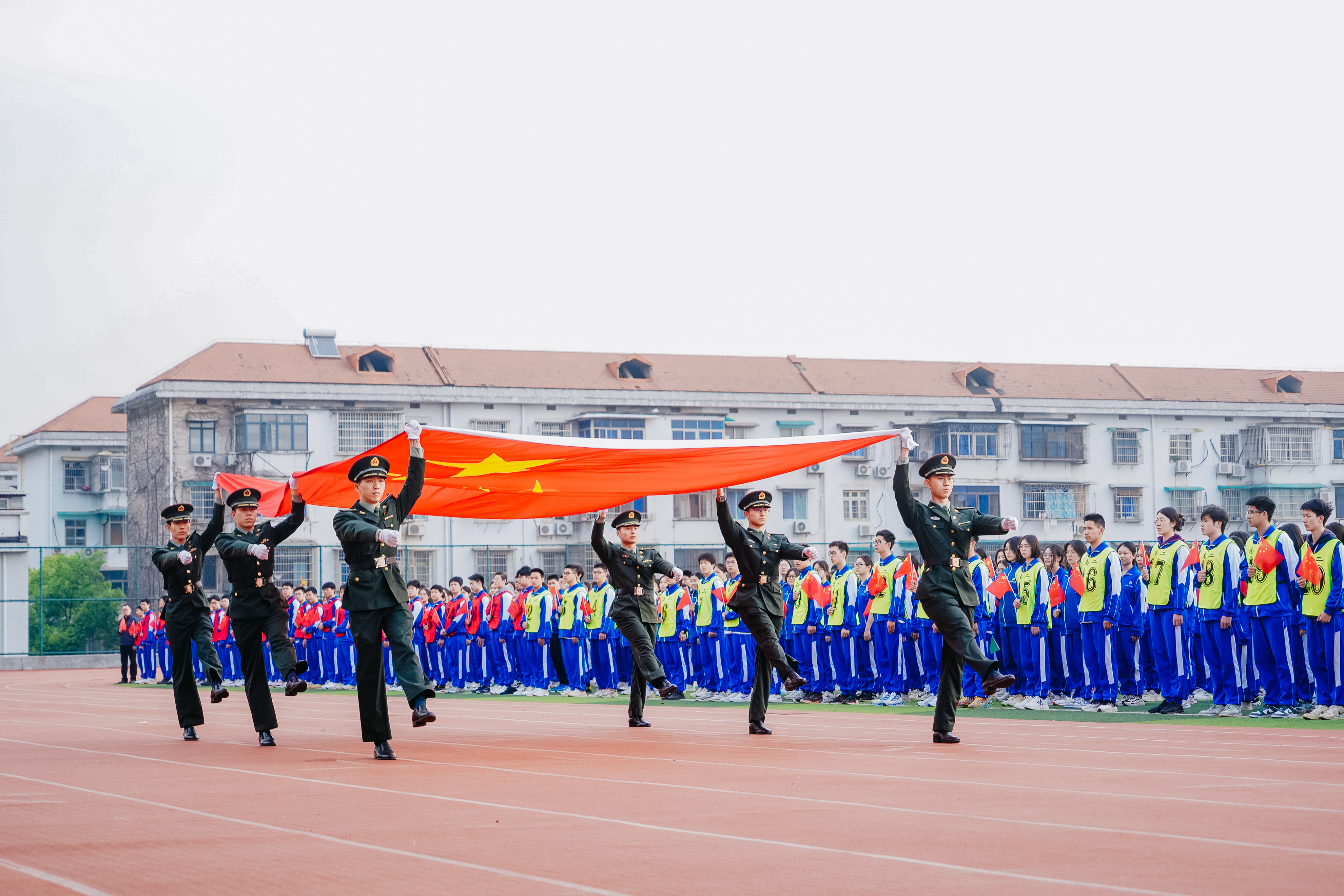 谢永红宣布迎旗开始,国防科技大学国旗护卫队护送天安门广场国旗入场,巡场展示。当雄壮的国歌声响起,五星红旗在晨光中冉冉升起,迎风飘扬。全体师生向国旗行注目礼,表达对祖国的无限热爱与崇高敬意。