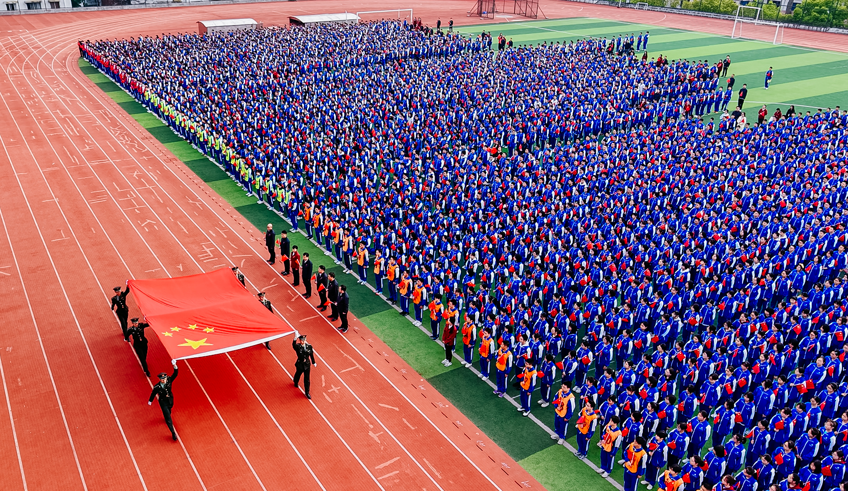 全体师生手持小红旗齐唱《歌唱祖国》,现场气氛达到高潮。