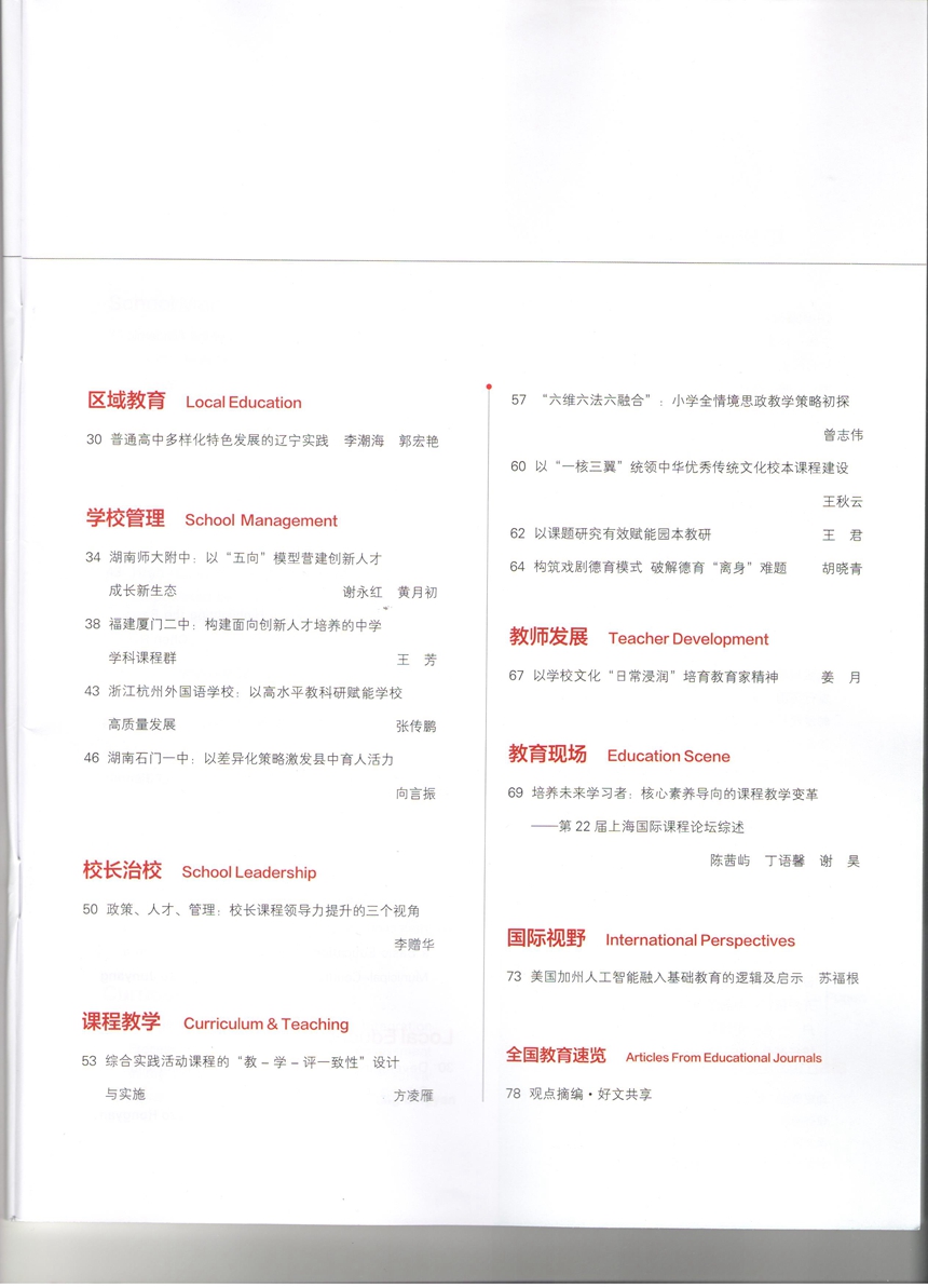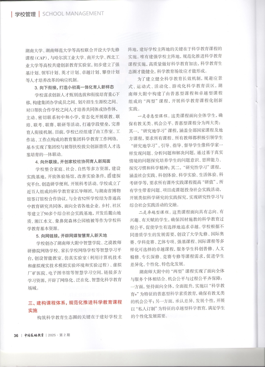 《湖南师大附中:以“五向”模型营建创新人才成长新生态》刊发于《中国基础教育》“学校管理”专栏。文章全面介绍了学校在教育“双减”中做好科学教育加法的理论探究和创新实践。近年来,学校针对目前中小学科学教育存在的课内外教学脱节、大中小衔接脱节、家校社育人脱节等问题,充分利用大学城中学、集团化办学、高校人才共育基地等办学优势,创设“向内挖潜、向上对接、向下衔接、向外联接、向网链接”的科学教育“五向”模型,构筑了“学校主阵地+社会大课堂+网媒新天地”的科学教育生态圈,形成了“科学教育见长,人文素质厚重”的鲜明特色。学校被教育部和中国科协评定为全国中学生英才计划十周年优秀中学,被中国科协认定为全国英才计划中学培养基地学校(湖南唯一),被教育部认定为全国首批中小学科学教育实验校,教改案例“基于学生科学素养培养的小中大贯通式科学教育实践探索”入选2024年度全国中小学科学教育工作优秀案例。