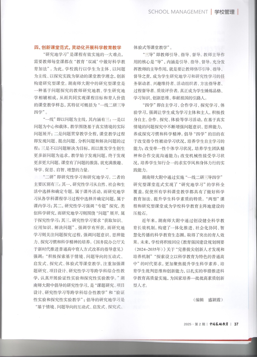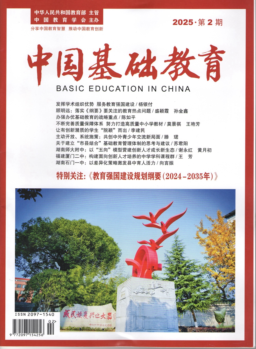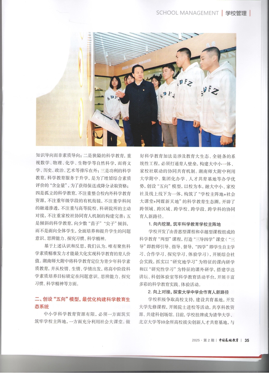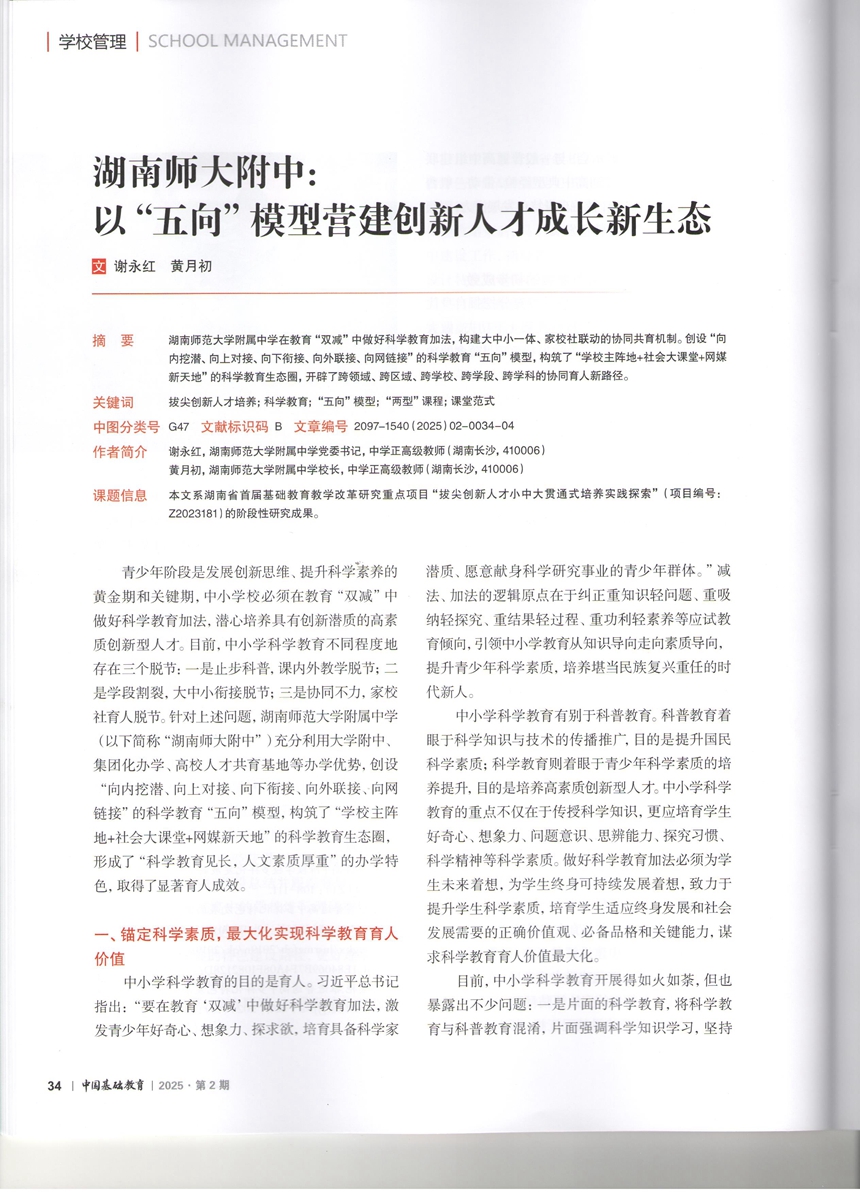 近日,《中国基础教育》(2025年第2期<总第30期>)以封面文章形式,刊发党委书记谢永红和校长黄月初联合署名文章《湖南师大附中:以“五向”模型营建创新人才成长新生态》,全面介绍学校创设科学教育“五向”模型,构筑科学教育生态圈,开辟协同育人新路径的思路和举措。
