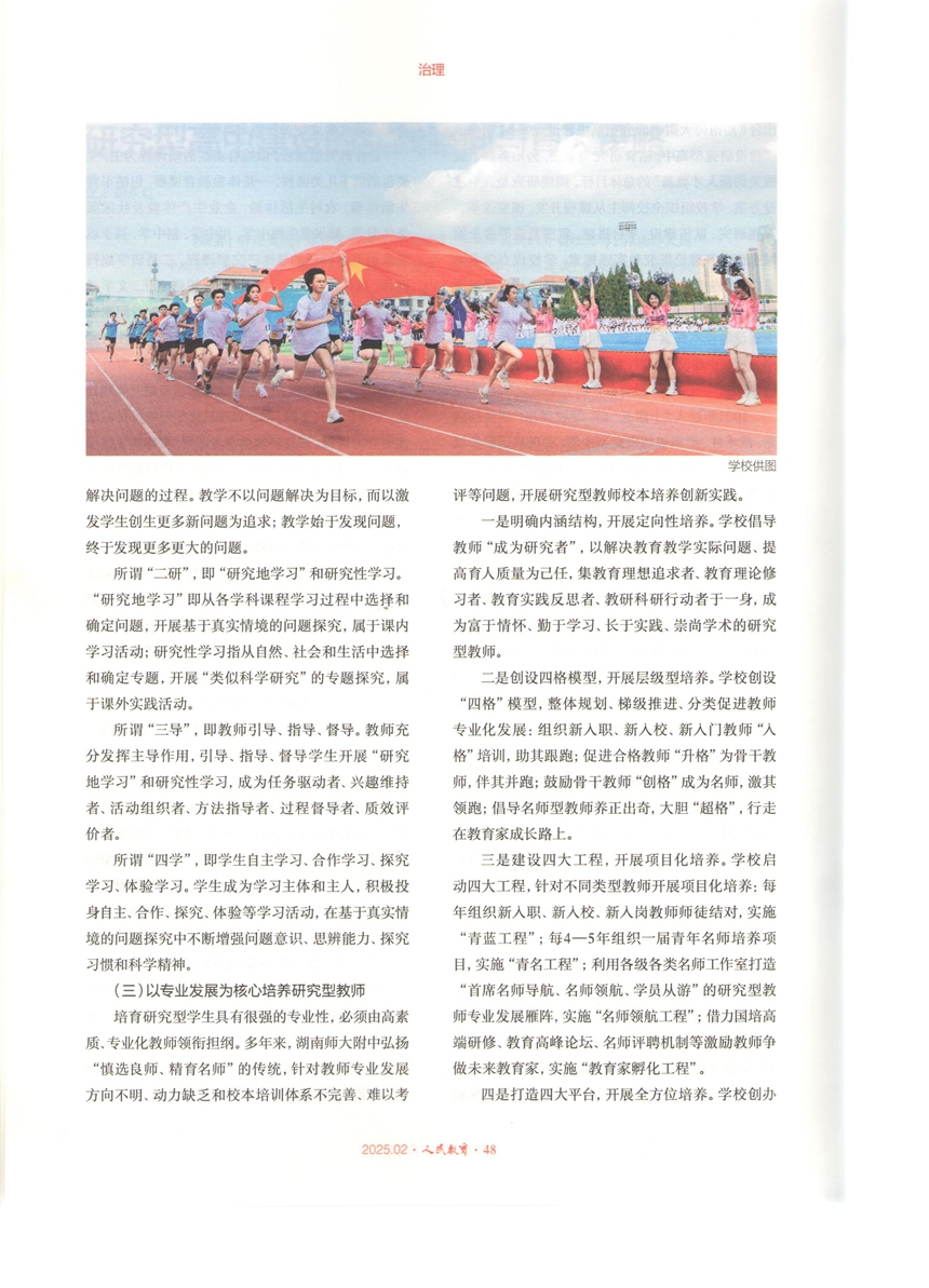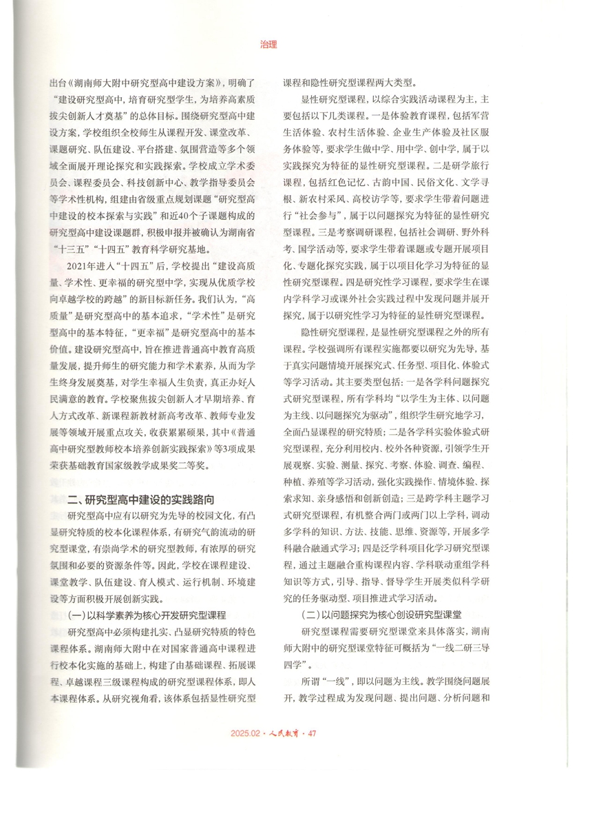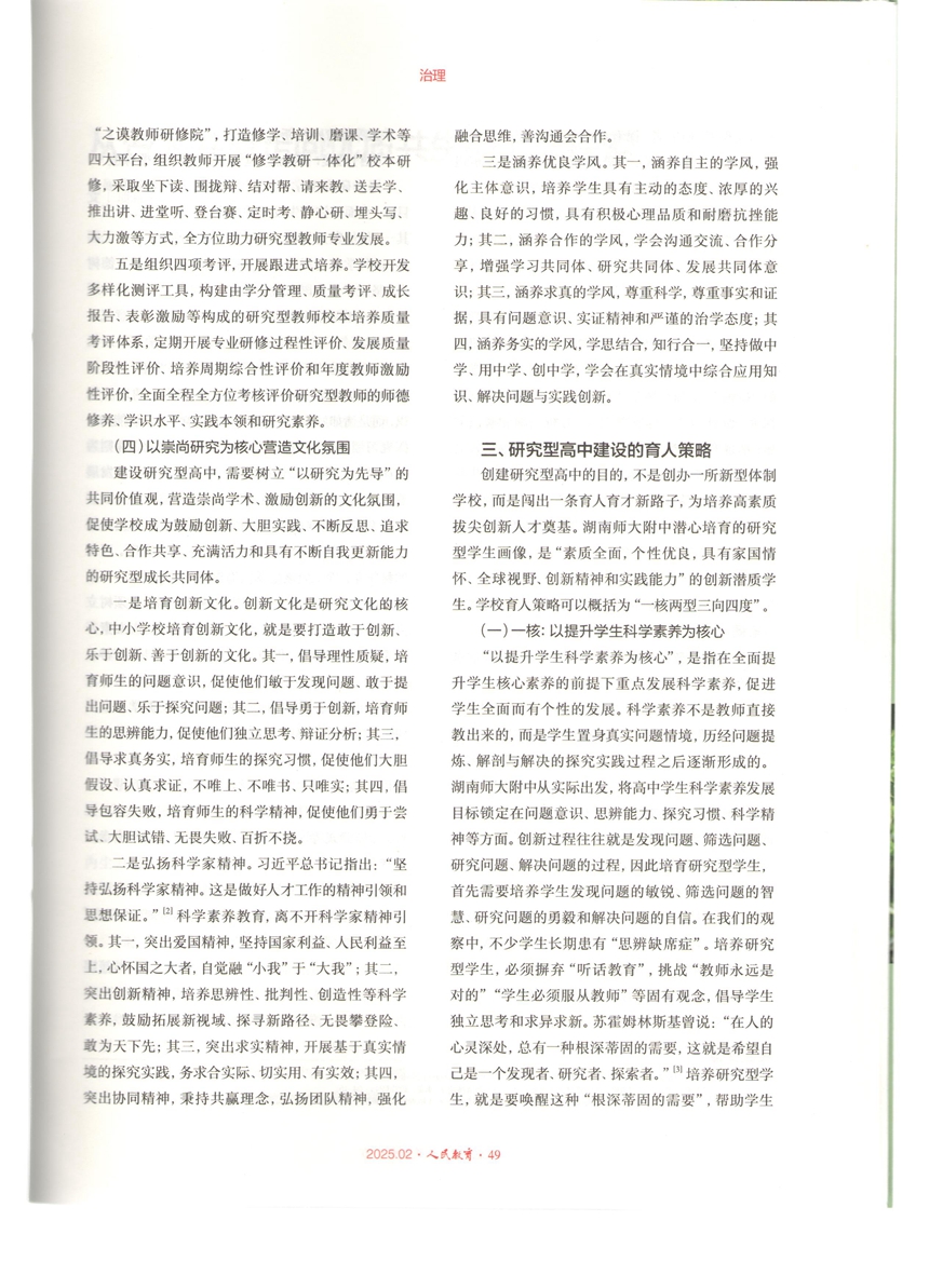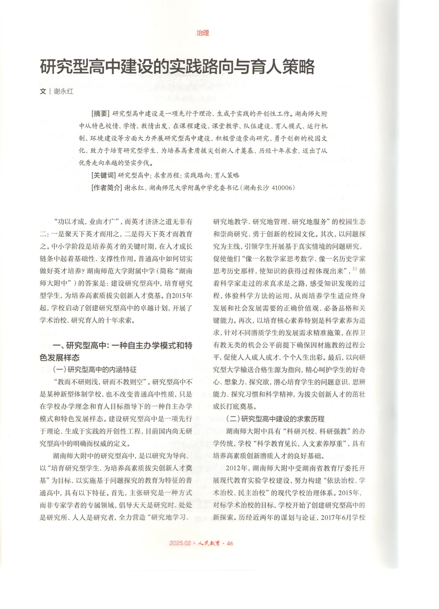 《研究型高中建设的实践路向与育人策略》刊发于《人民教育》“治理”专栏。文章从内涵特征、实践路向、育人策略等三个维度,系统梳理了学校在课程建设、课堂教学、队伍建设、育人模式、运行机制、环境建设等方面大力开展研究型高中建设的理论研究与实践探索概况。2015年以来,学校聚焦“培育研究型学生,为培养高素质拔尖创新人才奠基”的育人目标,从特色校情、学情、教情出发,全面启动了建设研究型高中的卓越计划和创新实践。历经十年求索,建构了基于实践探究的科学教育体系,树立了以研究为先导的共同价值观,营造了“研究地学习、研究地教学、研究地管理、研究地服务”的校园生态和崇尚研究、勇于创新的校园文化,形成了学术治校、科学育人的鲜明特色,取得了突出育人成效和丰硕研究成果。《研究型高中建设的实践路向与育人策略》的发表,标志着学校“用五至十年时间,建成高质量、学术性、更幸福的研究型高中”的办学目标基本实现。